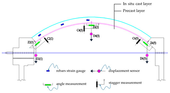 To study the structural behavior under half-span loading, key positions such as the arch feet, arch crown, and sliding interface were selected for displacement measurement. During the test, data on vertical displacement, stagger, and joint opening were recorded. At each selected position of the arch, two instruments of the same type were installed, numbered starting from the left side of the arch structure. Along the entire span, 6 cross-sections were selected for steel bar strain measurement. The left and right sides of the arch were arranged symmetrically, as shown in Figure 5. The monitored parts were located at the arch crown, arch feet, and quarter points of the entire arch. Among the monitoring instruments, the measurement precision of deflection, stagger, and displacement sensors was 0.001 mm, and the effective data precision adopted in this study was 0.01 mm, both of which were within the measurement precision range of the sensors.