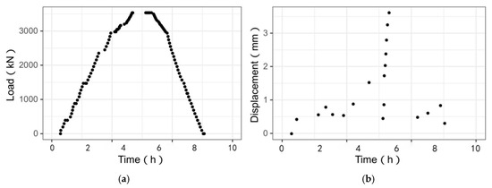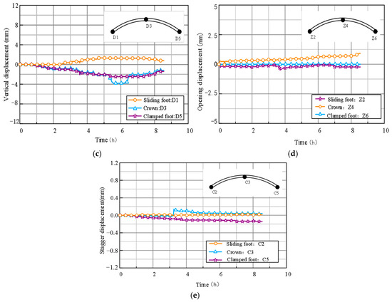 Before 5.23 h, the effect of half-span loading on the crown deflection was evident; however, the loading operation had little influence on the vertical displacement of the two arch feet, as shown in Figure 6c. After 5.23 h, as the sliding foot displacement was gradually increased, the arch axis became slightly flatter and its radius of curvature increased, resulting in downward movement at all points. By geometric relation, the maximum vertical displacement occurred at the crown. The vertical displacements of both arch feet also increased with the bearing displacement, though their maximum values remained similar and below 3 mm.