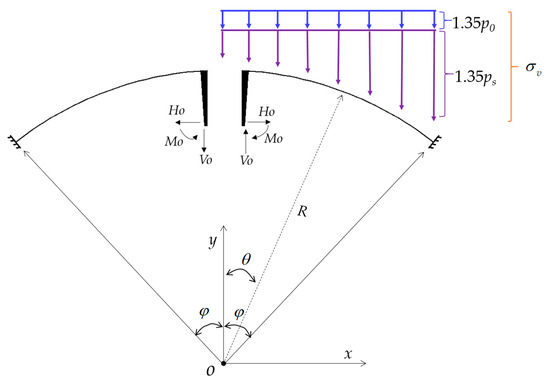 In order to derive analytical solutions for , , from Equation (2), , , , , , and need to be calculated, respectively. , , and stand for the bending moment, horizontal force, and the shear force at the elastic center, respectively. , , and denote shape constants, respectively, , , and represent load constants, respectively. The shape constant and load constant at the elastic center of the clamped circular arch are expressed by Equations (3) and (4):