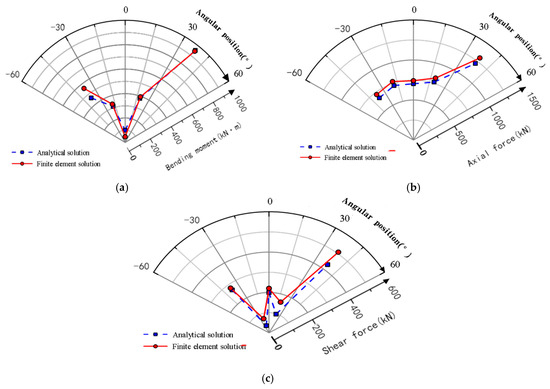 Comparison of analytical solution and numerical simulation: (a) bending moments; (b) axial force; (c) shear force.