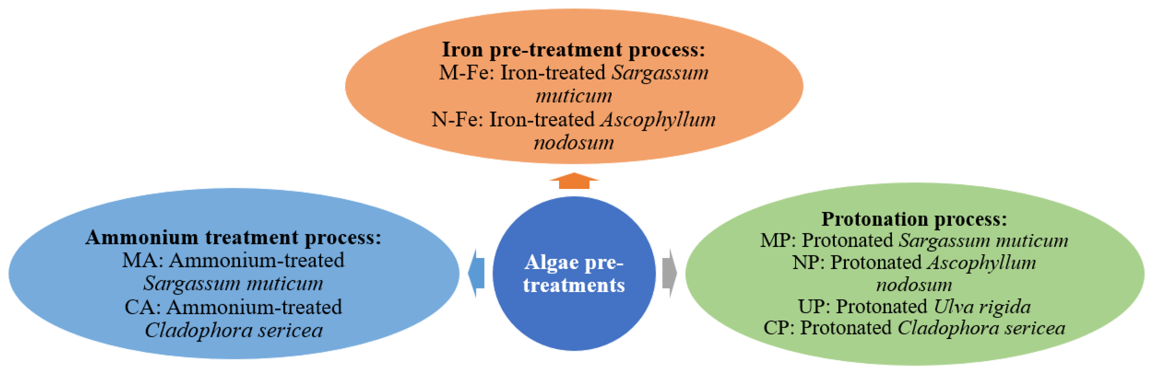- The chemical modification of the surfaces of Sargassum muticum, Cladophora sericea with ammonium followed the same procedure as described by Filote et al. [63]. The pre-treatment involved stirring the algae (at a dosage of 10 g L−1) with a 0.1 mol L−1 ammonia solution, which was prepared by diluting a commercial 25% NH3 solution (analytical grade), for a period of 24 h. After solid–liquid separation through filtration and washing, the ammonia-treated algae, designated as MA and CA, were dried at 60 °C. This pre-treatment aims to create a positively charged surface, which may enhance the retention of oxyanions.