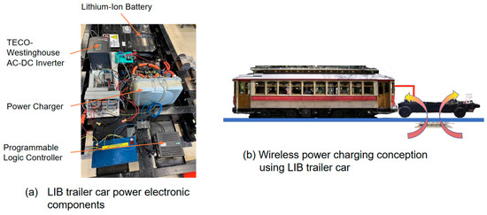 The trailer car repurposed to accommodate the battery system is presented in Figure 3, where a Nissan Leaf battery pack was installed to provide traction power to the trolley. Figure 3a illustrates the major power electronic components in the LIB trailer car, including the inverter, charger, and controller. Figure 3b presents the conceptual arrangement of wireless power charging applied to the LIB trailer car during motion. In case of battery fire, to ensure safety to the passengers, the LIB trailer car can be disengaged from the trolley and remotely drive away from the trolley.