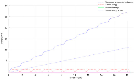 To evaluate the energy consumption, runtime, and power requirements for the Belmont–Gastonia run, a MATLAB R2022a-based kinematic simulation was performed. Figure 6 shows the results of kinetic energy, potential energy, traction energy, and work performed against resistance for the route. Energy consumption increases linearly with distance, with pronounced peaks during acceleration phases after each stop. The altitude and time profile are shown in Figure 7. The distance–time profile of the route is shown in Figure 8. While the altitude variations along the 20 km route are relatively modest, they contribute to gravitational resistance and influence the overall energy demand.