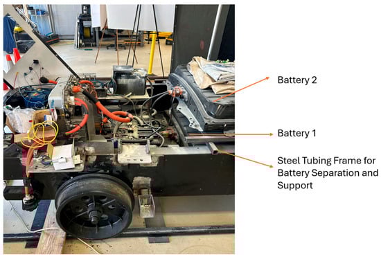 Based on these results, a single battery design cannot support a full round trip from Belmont to Gastonia and back, which would require 56 kWh of energy. To address this limitation, the trailer car was modified to carry two LIB packs, as shown in Figure 9. As a safety measure, between the two battery packs, there was a gap of 50 mm, which allowed the insertion of computer fans for the cooling off the LIBs. The brakes of the trailer car have electric deployments that can lock the wheels in case of a battery fire. An alternative solution would be to implement a battery swap at the Gastonia station. Further analysis is presented in the next section to evaluate realistic daily operation scenarios with two installed batteries.