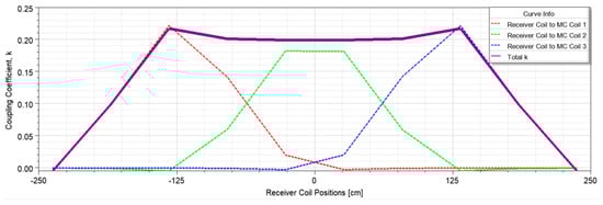 All electromagnetic calculations are carried out in Ansys Maxwell 3D. For each material system, a parametric sweep is performed with the Rx translated along the track centerline across the three-segment assembly (from −250 cm to +250 cm in 10 cm increments). At each position x, the solver returns the self-inductances and , and the mutual inductances between the Rx and each transmitter coil The position-dependent coupling for each pair is then calculated by