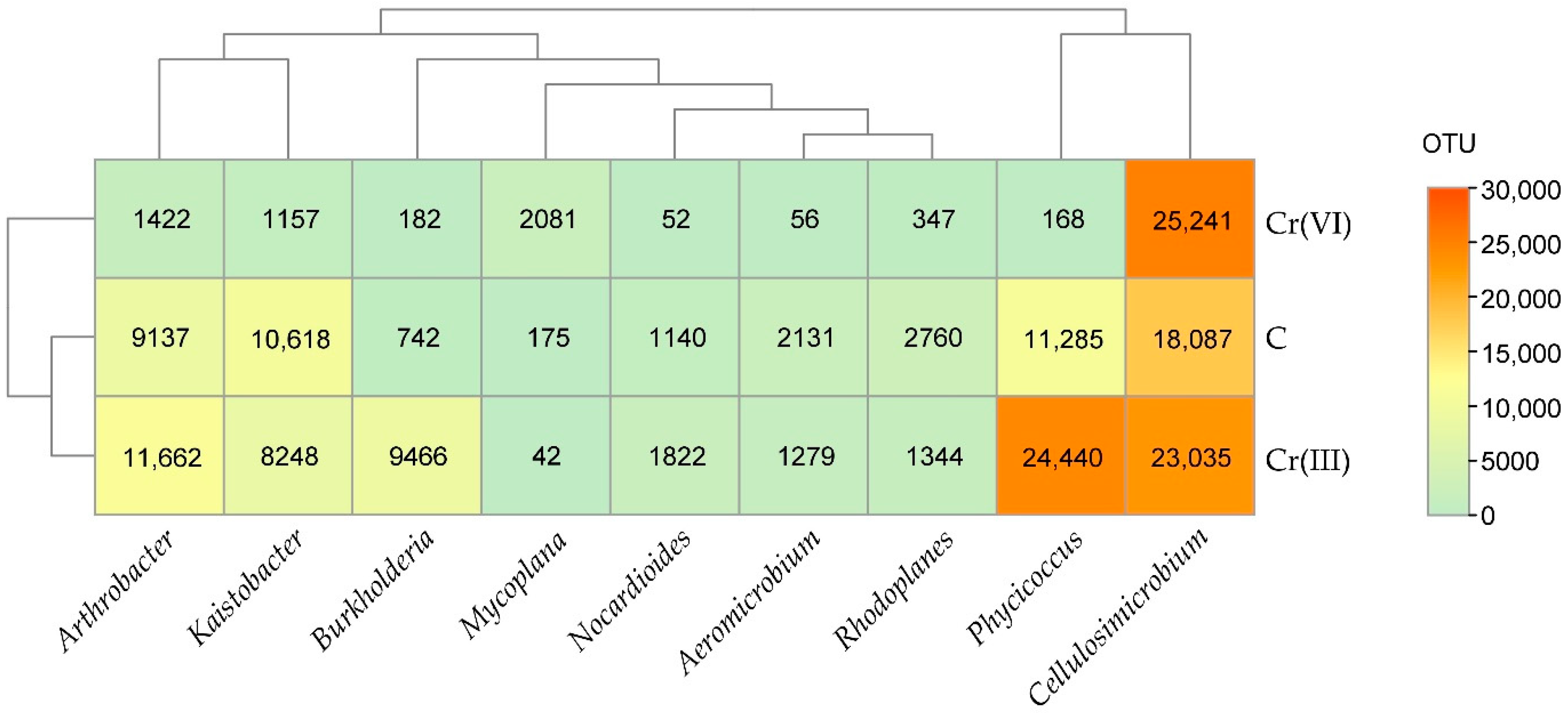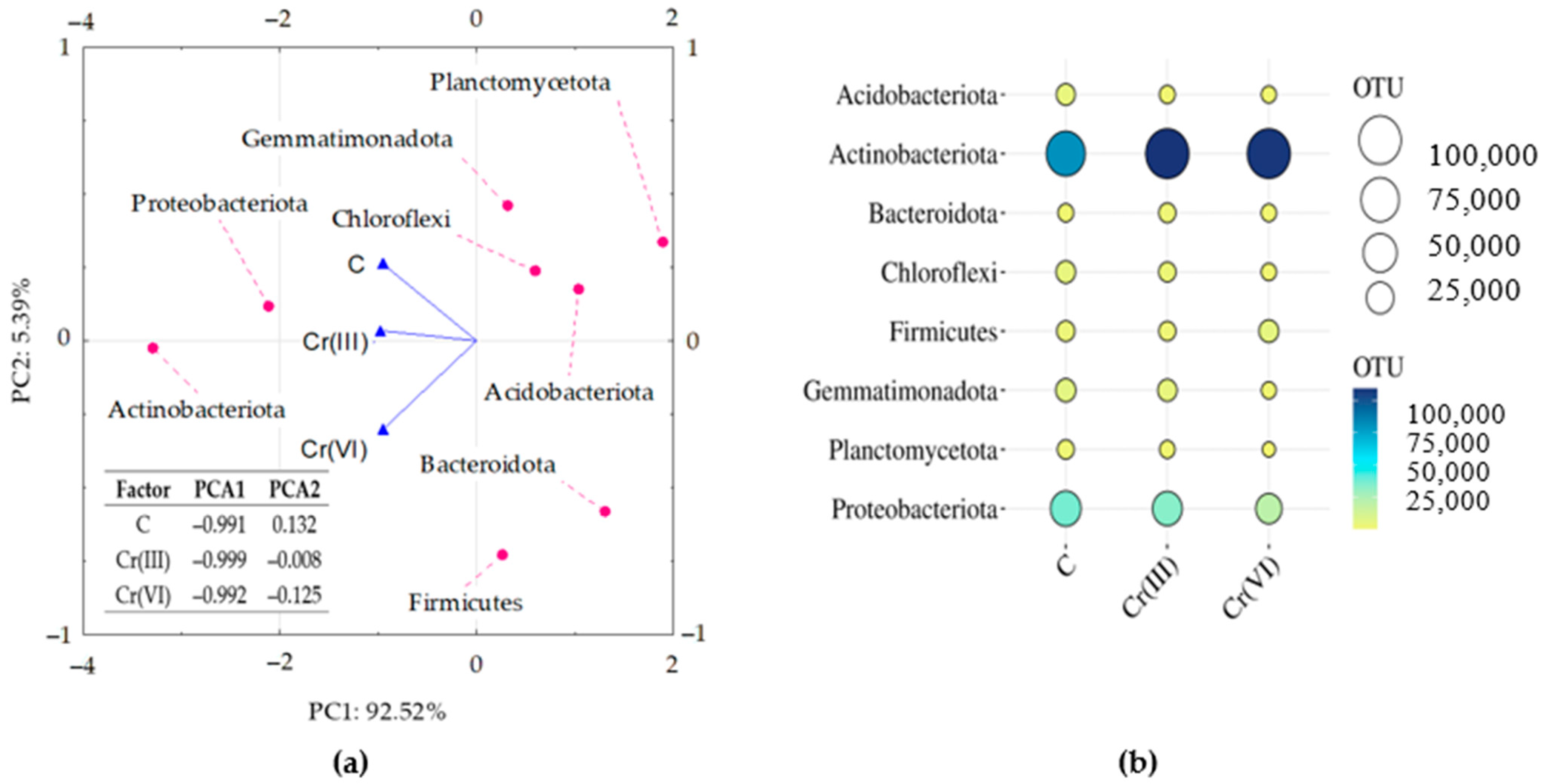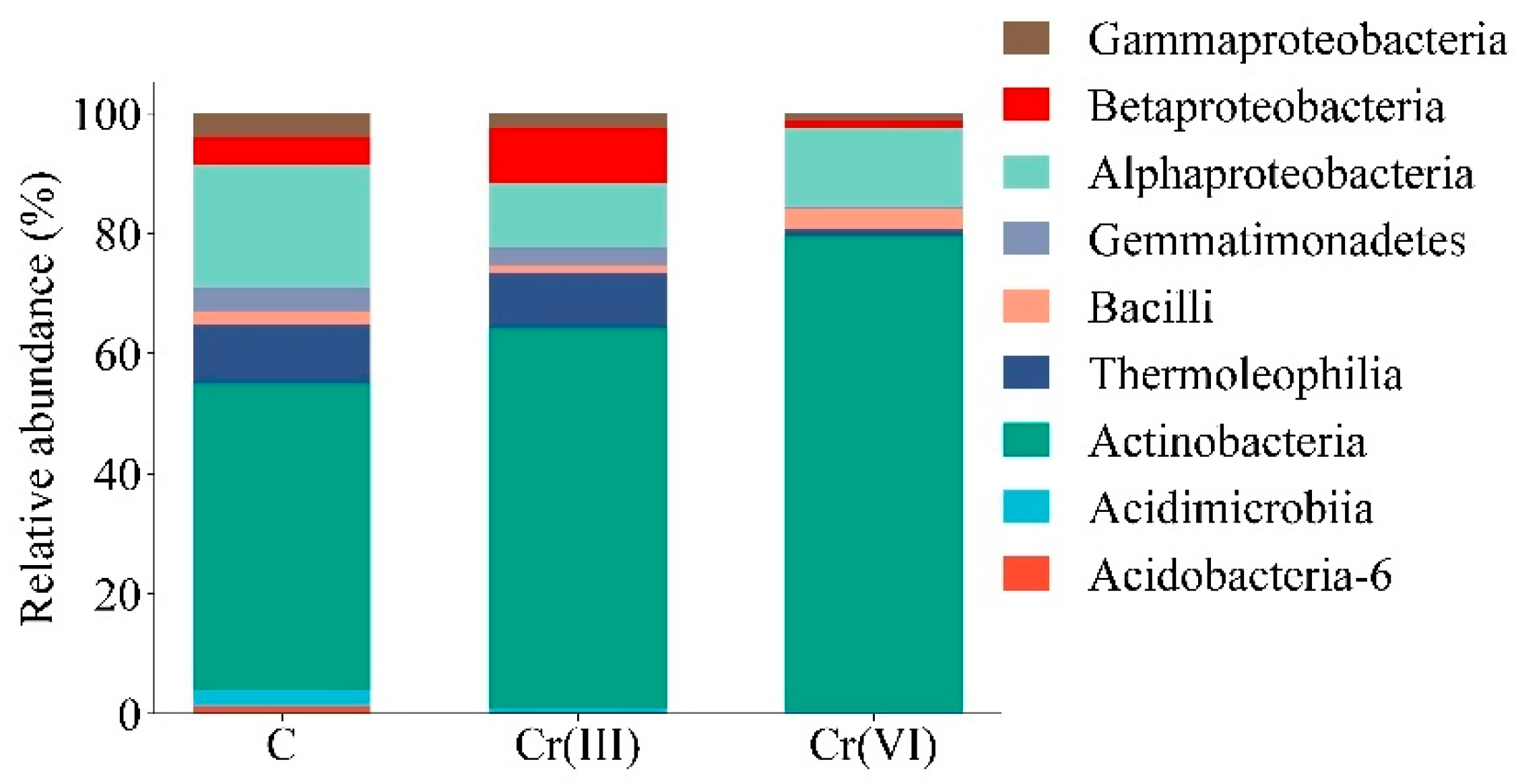 - Zhu, Y.; Song, K.; Cheng, G.; Xu, H.; Wang, X.; Qi, C.; Zhang, P.; Liu, Y.; Liu, J. Changes in the bacterial communities in chromium contaminated soils. Front. Vet. Sci. 2023, 9, 1066048. [Google Scholar] [CrossRef] [PubMed]