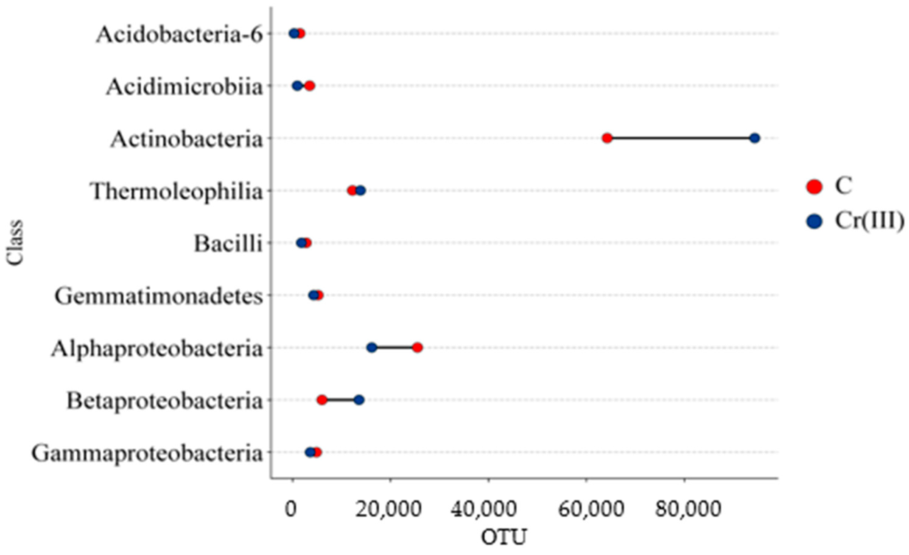 4.1. Structure of Soil Bacterial Communities Under Exposure to Cr(III) and Cr(VI)