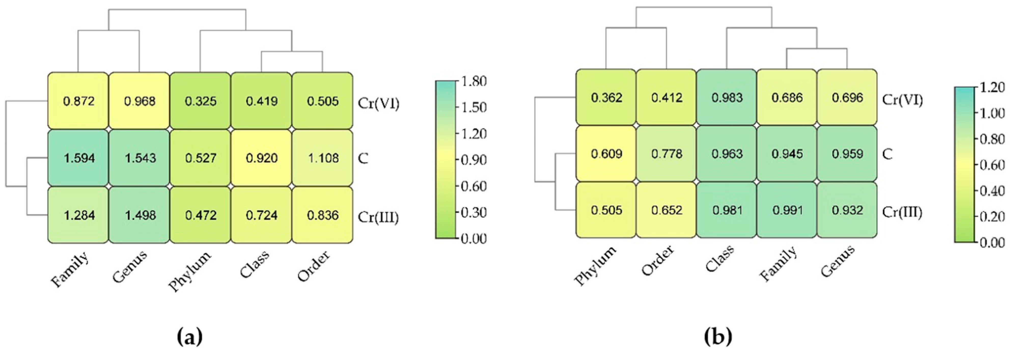 - Wang, B.; Zhu, S.; Li, W.; Tang, Q.; Luo, H. Effects of chromium stress on the rhizosphere microbial community composition of Cyperus alternifolius. Ecotoxicol. Environ. Saf. 2021, 218, 112253. [Google Scholar] [CrossRef]
