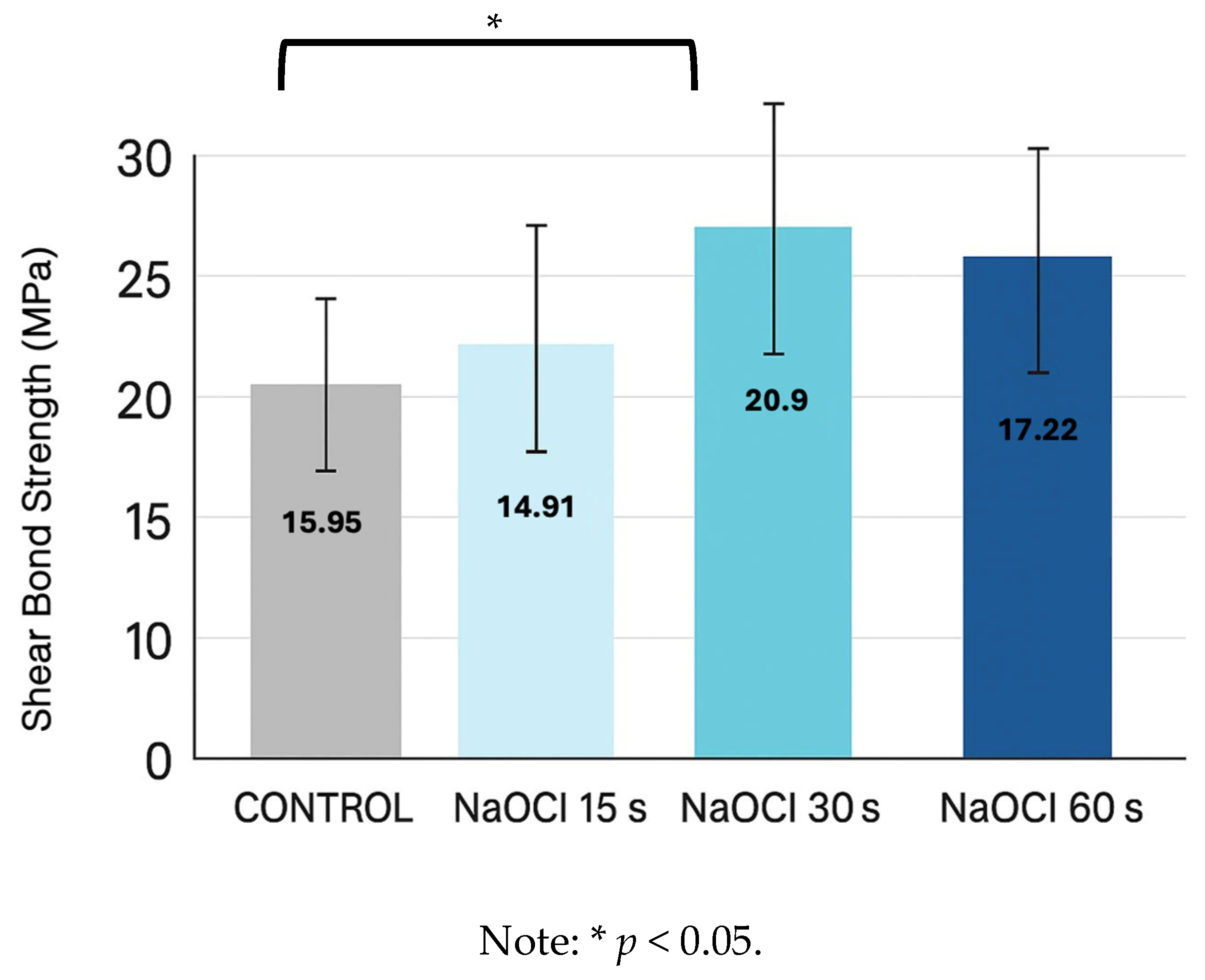 - Mas-López, A.C.; Robles-Ruiz, J.; Arriola, L.E. Effect of sodium hypochlorite as a deproteinizing agent on the bond strength of metal brackets. J. Clin. Pediatr. Dent. 2024, 16, e947–e952. [Google Scholar] [CrossRef]