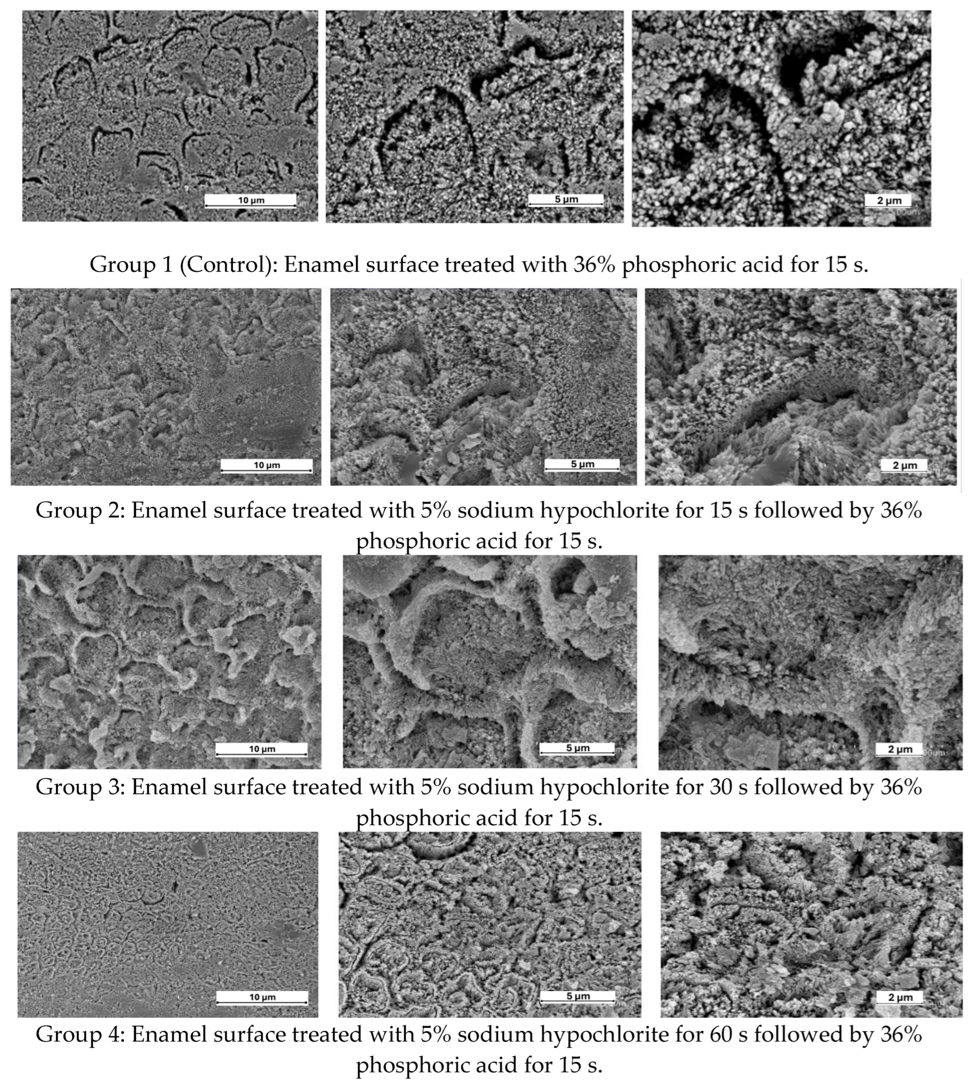 - Alharbi, A.; Smith, J.; Johnson, L. Effect of sodium hypochlorite deproteinization on bond strength in fluorotic enamel. Angle Orthod. 2023, 93, 421–428. [Google Scholar]