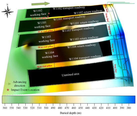 To mitigate such hazards, the mine adopted a mitigation strategy that involved progressively increasing the spacing of protective coal pillars between adjacent working faces, extending the pillar width from 15 m to 50 m, as shown in Figure 1. Nevertheless, this adjustment led to considerable loss of recoverable coal due to over-conservative pillar dimensions.