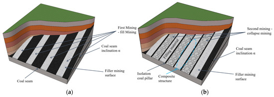 Strip filling mining, a refined approach derived from partial backfill techniques, progresses through two sequential stages: the initial stage involves backfilling operations, followed by a controlled collapse phase. This composite support structure formed during the process has been demonstrated to substantially improve coal recovery efficiency [15,16], as illustrated in Figure 2. Given the increasing emphasis on operational safety and resource utilization in modern mining engineering, improving the extraction rate of coal seams has become a critical priority. Previous studies have shown that designing an isolation pillar with a standard width of 15 m can maintain structural integrity, and the corresponding overburden movement patterns have been analyzed [17]. Nevertheless, uncertainties remain regarding the impact-related hazards of strip filling mining, which limits its broader engineering application. Based on existing findings, there is a clear need for comprehensive and in-depth studies focused on evaluating the impact hazards of strip filling mining under upward mining conditions. Such investigations carry significant theoretical and engineering value for enabling secure and efficient exploitation of deep coal resources.