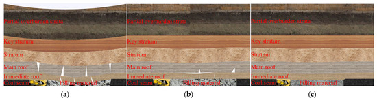 The backfill material plays a crucial role in maintaining the structural integrity of the goaf, as it contributes significantly to the stabilization of the mined-out area. If sufficient support is lacking during excavation, the hard roof may remain suspended for a prolonged time without collapsing, resulting in continuous elastic energy buildup and a heightened likelihood of rockburst events. The inclusion of the filling body alleviates this hazard by bearing part of the roof load, which reduces both the extent of deflection and subsidence. As a result, stress redistribution occurs, promoting a more balanced stress environment in the roof and thereby decreasing the probability of rockburst occurrences [18]. Moreover, the synergy between the filling body and the surrounding rock gives rise to a unified structural configuration, enhancing the global stability of the rock mass and efficiently preventing delamination and fracturing of the roof layer. It is also important to note that varying the filling rate significantly impacts the deformation and failure behavior of the hard roof. The degree of control over roof stability varies noticeably depending on the specific filling rate conditions, as demonstrated in Figure 3. Through a detailed and structured evaluation, the following key characteristics are identified [19,20,21]: