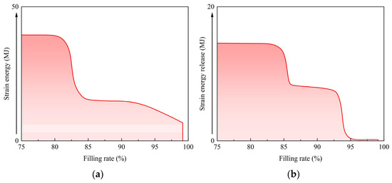 Once the filling body is introduced into the goaf, it establishes a stabilizing support system that significantly suppresses the displacement and fracture development of the overlying hard roof. This structural restraint plays a crucial role in maintaining the integrity of the overburden. From a mechanical perspective, a strong coupling interaction forms between the overlying roof strata and the filling material, creating a synergistic response to external loads and stress redistribution. More specifically, the filling body functions as a regulatory medium that modulates the roof’s stress field through multiple mechanisms. These include the prevention of excessive energy buildup, the buffering of abrupt energy release events, and the damping of energy transmission within the rock mass. Collectively, these effects substantially diminish the probability of rockburst hazards associated with hard roof behavior under mining-induced disturbances [22,23]. Figure 4 illustrates the relationship characteristics between elastic energy accumulation and release under different filling rate conditions. At low filling rates, energy accumulates significantly and is released abruptly, resembling conventional caving mining. At high filling rates, energy accumulation is suppressed, and the release becomes gradual due to the buffering effect of the filling body.