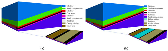 Numerical simulation models. (a) Original mining method; (b) Strip filling mining method.