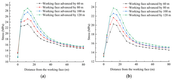 Advance abutment pressure curves at the working face. (a) Original mining method; (b) Strip filling mining method.