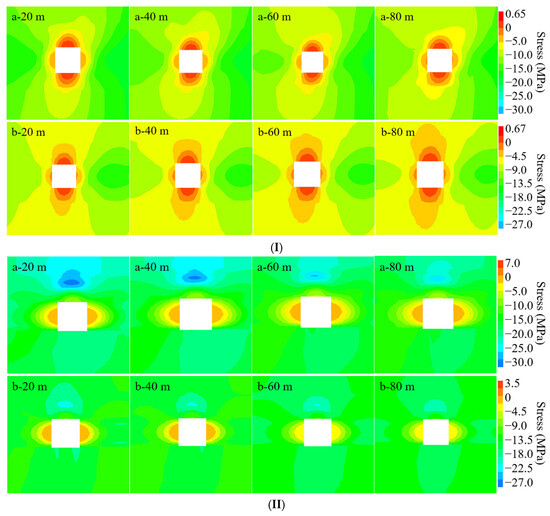 Stress contour diagrams of roadway surrounding rock at different advance distances of the working face. (I) Vertical Stress; (II) Horizontal Stress. (a—Original mining method; b—Strip filling mining method).