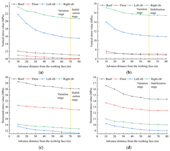 Stress distribution curves of roadway surrounding rock at different advance distances of the working. (a) Vertical stress—Original mining method; (b) Vertical stress—Strip filling mining method; (c) Horizontal stress—Original mining method; (d) Horizontal stress—Strip filling mining method.
