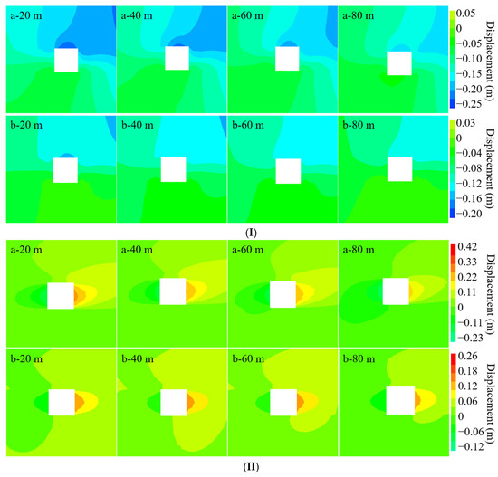Displacement contour diagrams of roadway surrounding rock at different advance distances of the working face. (I) Vertical Displacement; (II) Horizontal Displacement (a—Original mining method; b—Strip filling mining method).