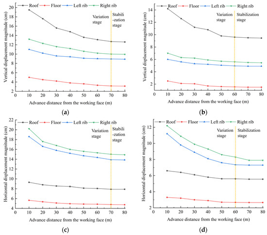 Vertical displacement curves of roadway surrounding rock at different advance distances of the working face. (a) Vertical displacement—Original mining method; (b) Vertical displacement—Strip filling mining method; (c) Horizontal displacement—Original mining method; (d) Horizontal displacement—Strip filling mining method.