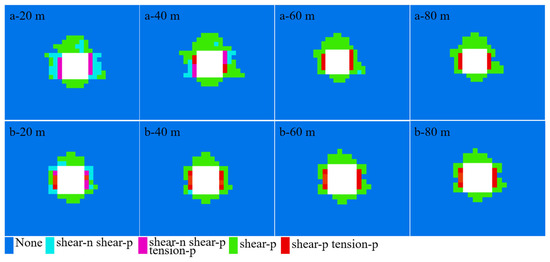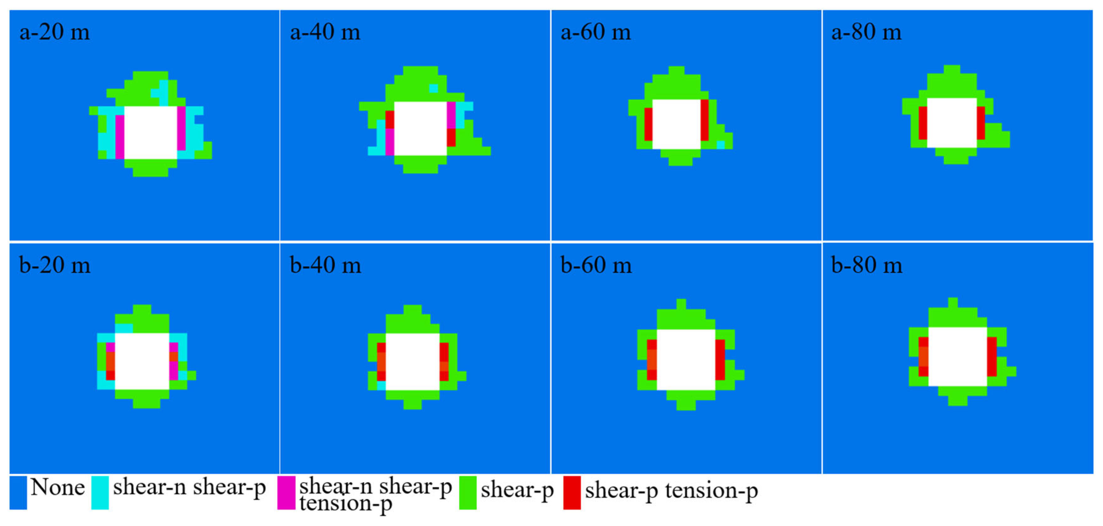 The spatial distribution pattern of plastic zones exhibits substantial variation as the working face advances. When the excavation reaches approximately 20 m, the plastic deformation zone expands to its largest extent and is highly susceptible to mining-induced disturbances. As the face progresses into the range of 20–60 m, the plastic region becomes more confined, showing a tendency to cluster around the sidewalls. With continued advancement of the working face toward the interval of 60–80 m, the plastic zone contracts further, with deformation predominantly localized in the roof strata. Beyond this range, both the geometric configuration and extent of the plastic zones remain relatively stable, with minimal observable variation.