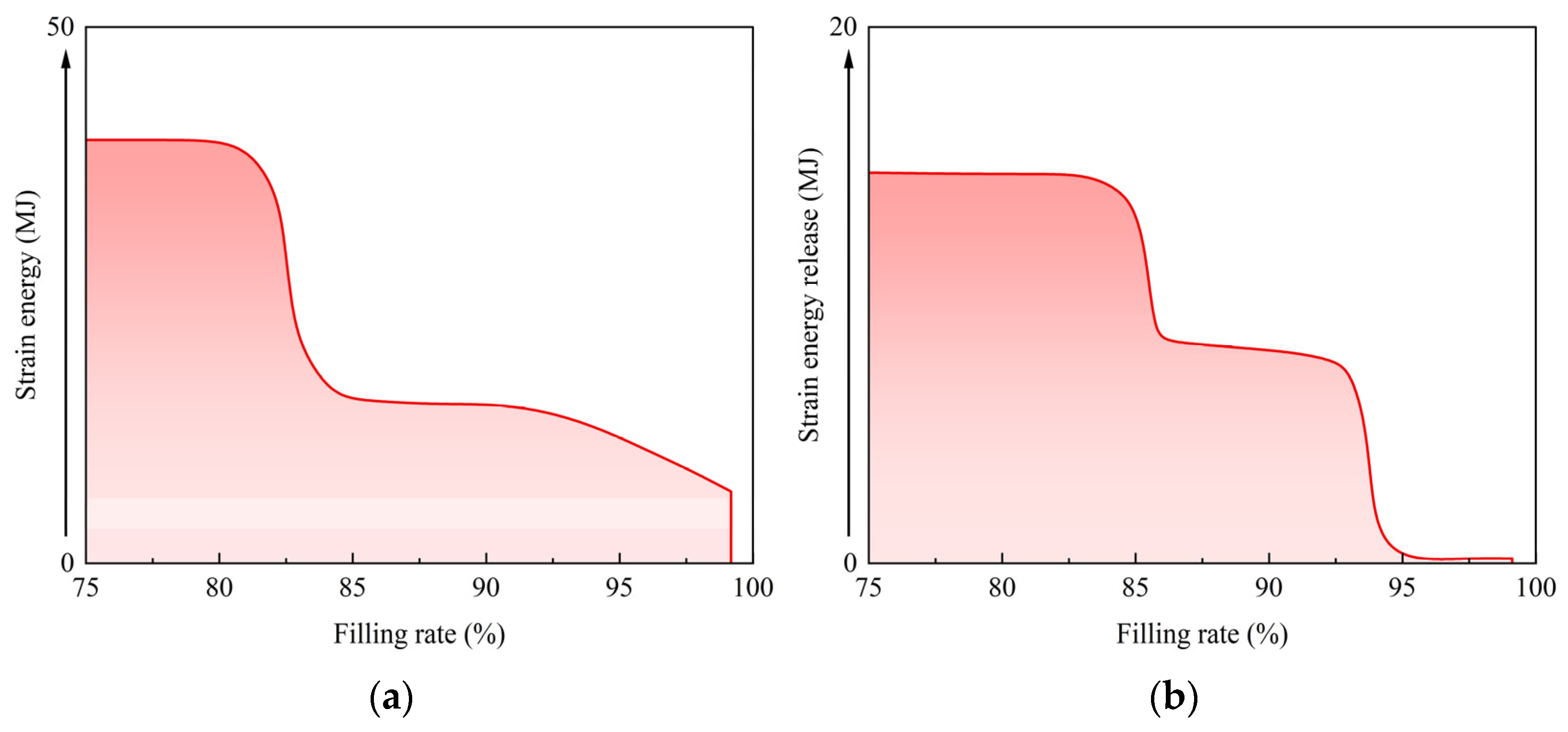 Figure 4 illustrates the relationship characteristics between elastic energy accumulation and release under different filling rate conditions. At low filling rates, energy accumulates significantly and is released abruptly, resembling conventional caving mining. At high filling rates, energy accumulation is suppressed, and the release becomes gradual due to the buffering effect of the filling body.
