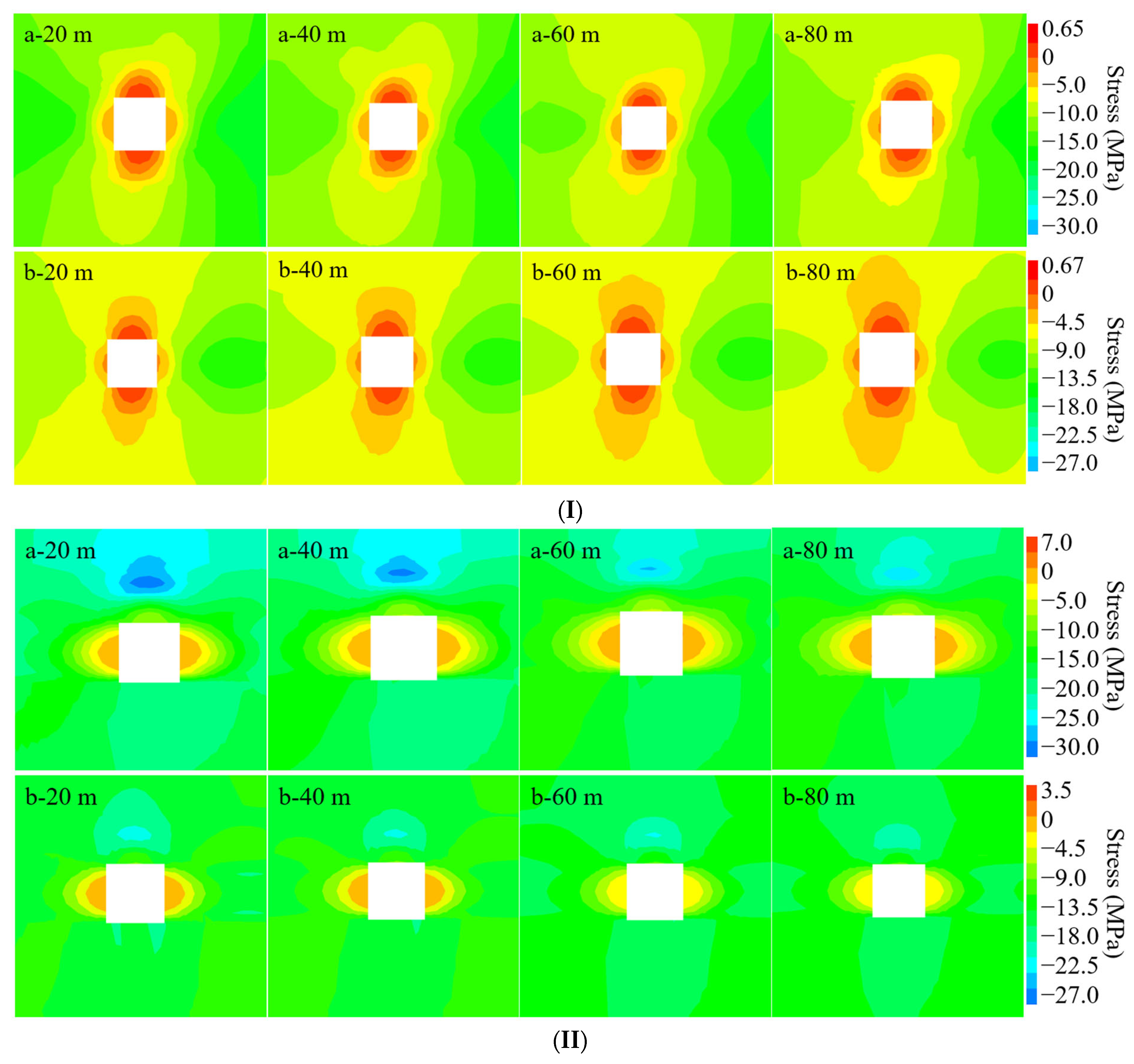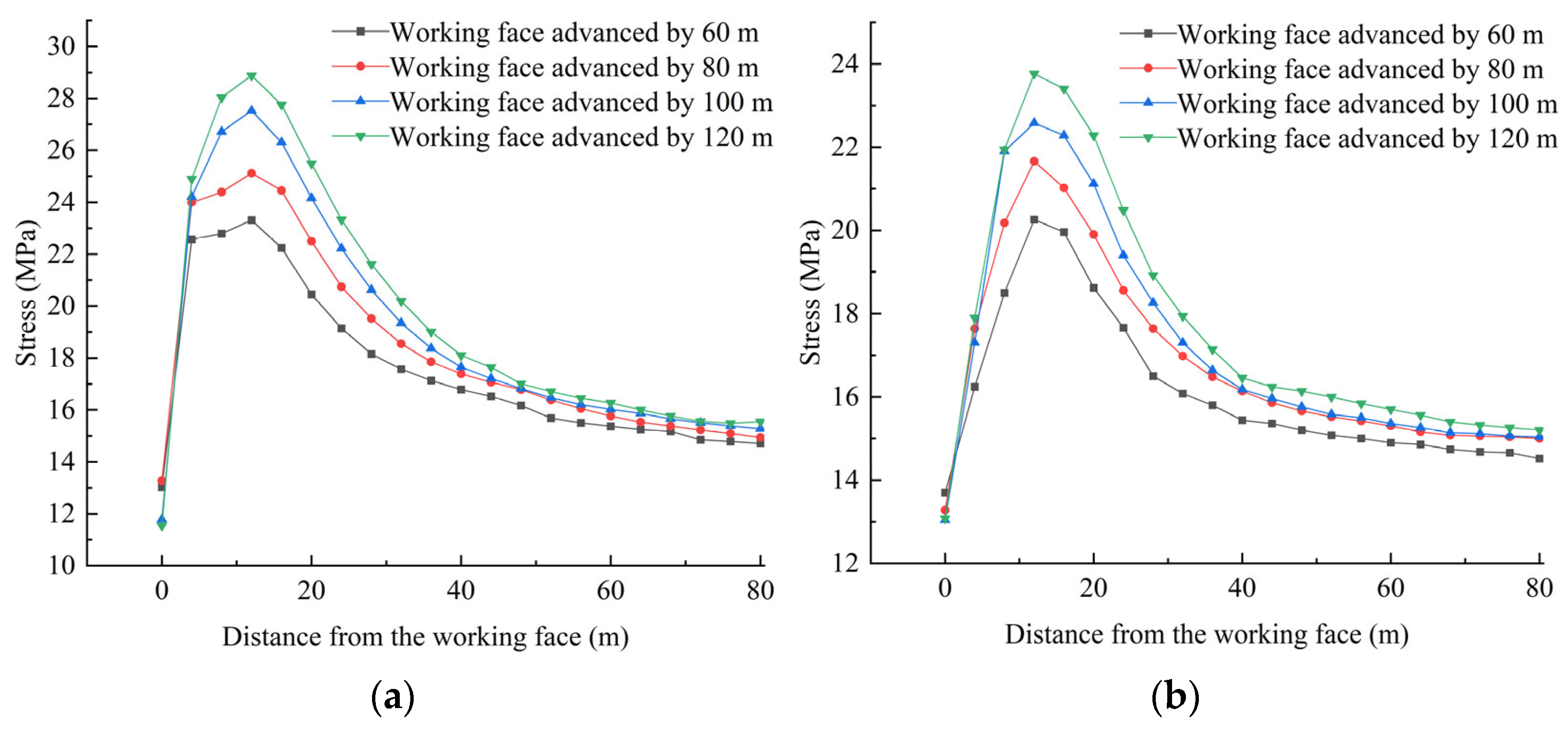 Figure 6, within the context of the traditional mining scheme, the peak value of advance abutment pressure gradually increases with excavation progress—reaching 23.3 MPa at 60 m. Further increments to 80 m, 100 m, and 120 m correspond to successive peaks of 25.1 MPa, 27.5 MPa, and 28.9 MPa, respectively. This steady escalation in peak pressure reflects a progressive intensification of stress concentration associated with continuous excavation. In particular, the stress-affected region expands up to a distance of approximately 70 m in advance of the working face.