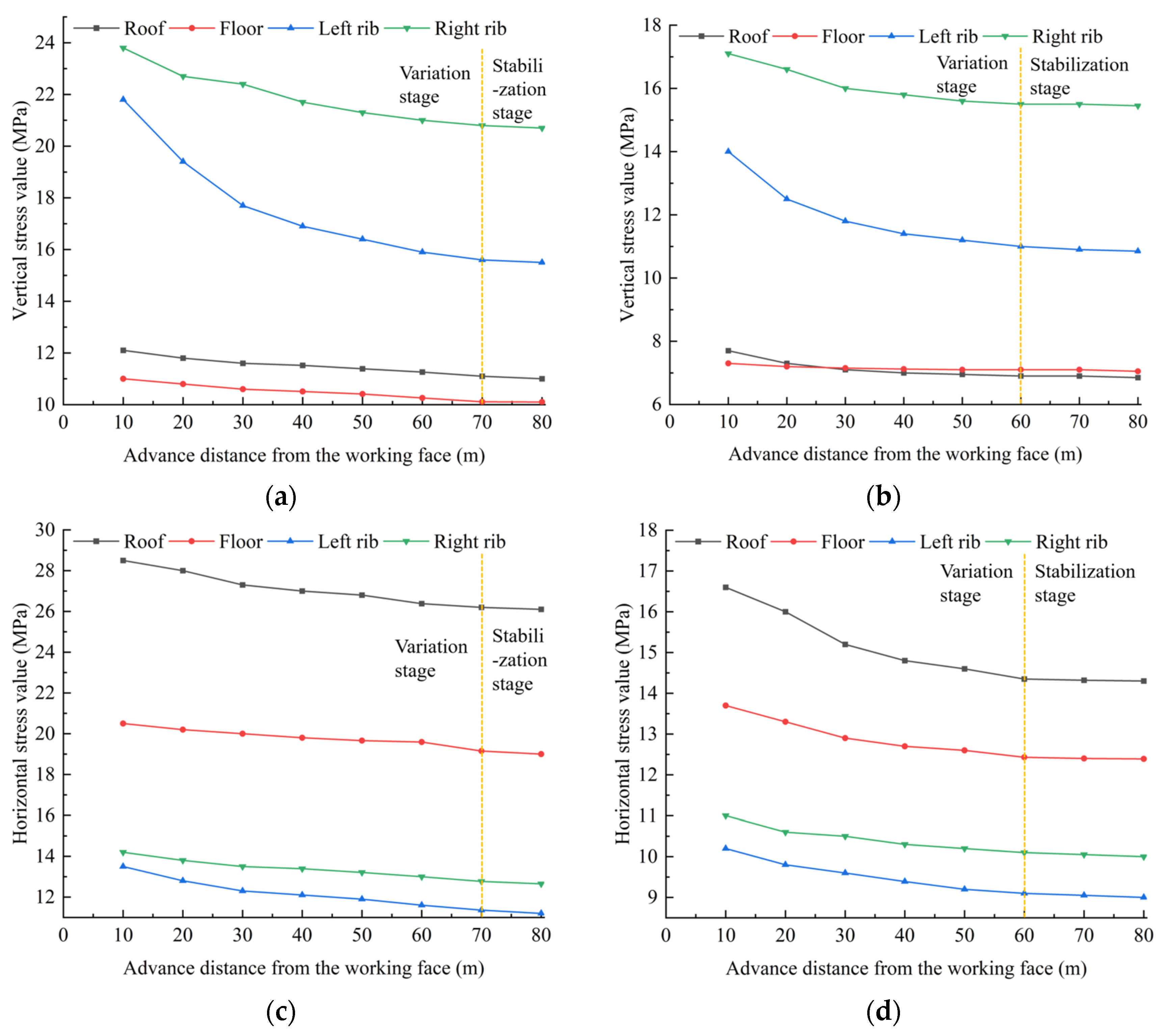 Figure 7 illustrates the cloud diagrams of stress fields in the roadway surrounding rock at various advancement distances for the two mining approaches. As the excavation face extends to 100 m, the surrounding rock shows distinct stress evolution behaviors in both vertical and lateral orientations. The vertical component of stress forms a concentric, semi-elliptical pattern spreading outward from the roadway, with pronounced intensities on both flanks compared to the roof and floor. Similarly, the lateral stress demonstrates a semi-elliptical distribution, where its peak values are also located near the roof and floor zones. In the bottom strata, lateral stress spans a wider area, whereas its intensity along the sidewalls is reduced and confined to a narrower band. While both mining strategies exhibit comparable distribution tendencies, the overall magnitudes of vertical and lateral stress within the roadway environment are notably diminished in the strip filling mining scenario compared to the conventional method, thereby helping to mitigate impact hazard.