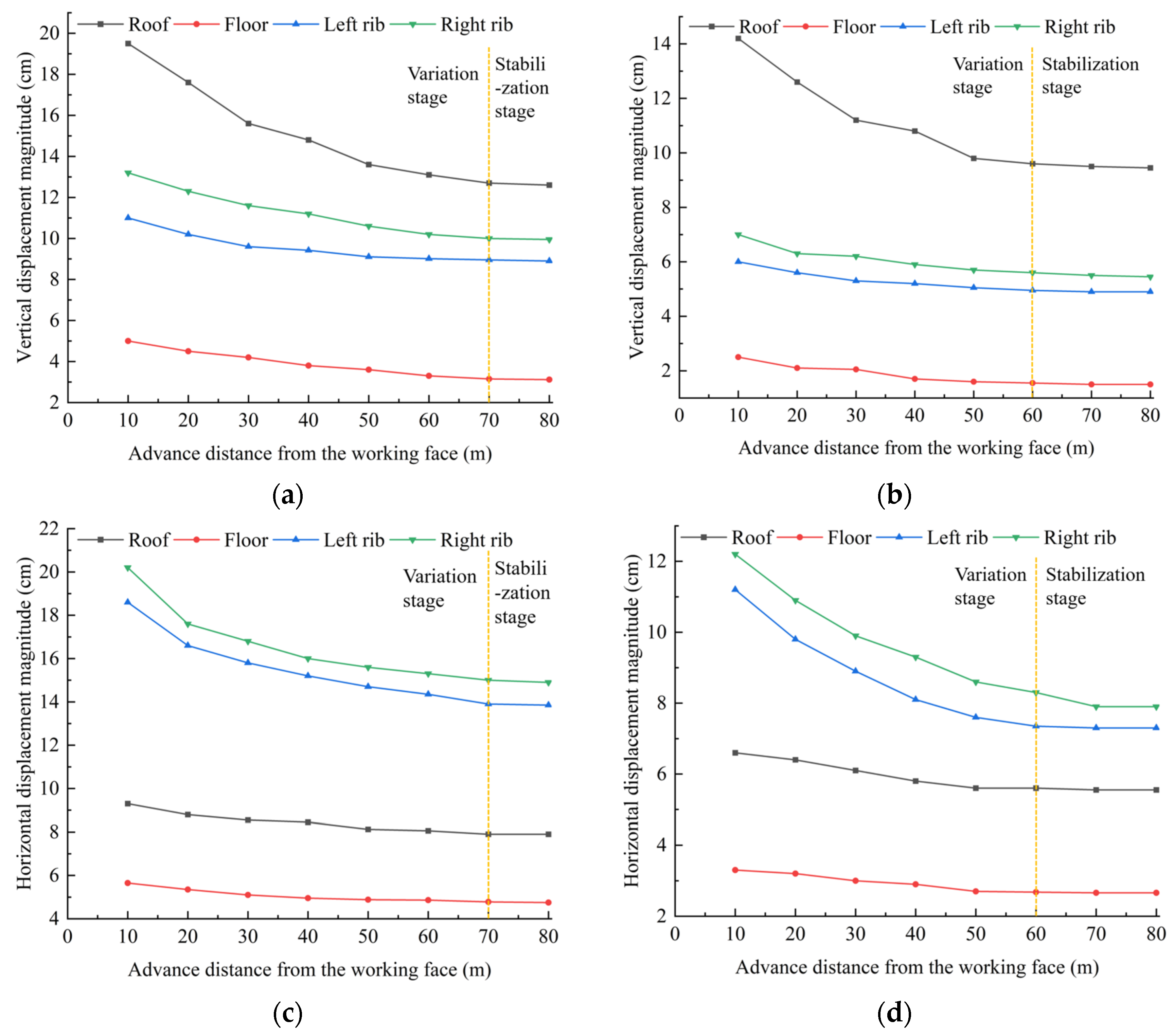 Figure 8 depicts the variation curves of stress within the surrounding rock of the roadway at varying excavation depths for both mining techniques. As excavation progresses, the stress field in the surrounding rock demonstrates a clearly defined spatial pattern. Specifically, the vertical component of stress tends to accumulate near the roadway’s sidewalls, whereas the horizontal stress primarily localizes around the roof and floor. With increased face advancement, both stress components exhibit a general decline. Furthermore, for the conventional mining approach, stress levels tend to stabilize once the face has progressed approximately 70 m. In contrast, under strip filling conditions, stabilization occurs earlier, at around 60 m. Stabilization was identified when the rate of change in stress or displacement values became negligible with further advancement of the working face. This assessment was based on monitoring the stress and displacement curves, which showed that beyond these critical distances (70 m for conventional and 60 m for strip filling mining), the values plateaued, indicating that the mining-induced influence had reached a steady state. These findings suggest that, relative to the traditional method, the strip filling approach offers improved conditions for ensuring roadway integrity and mitigating impact-related hazards during underground operations.