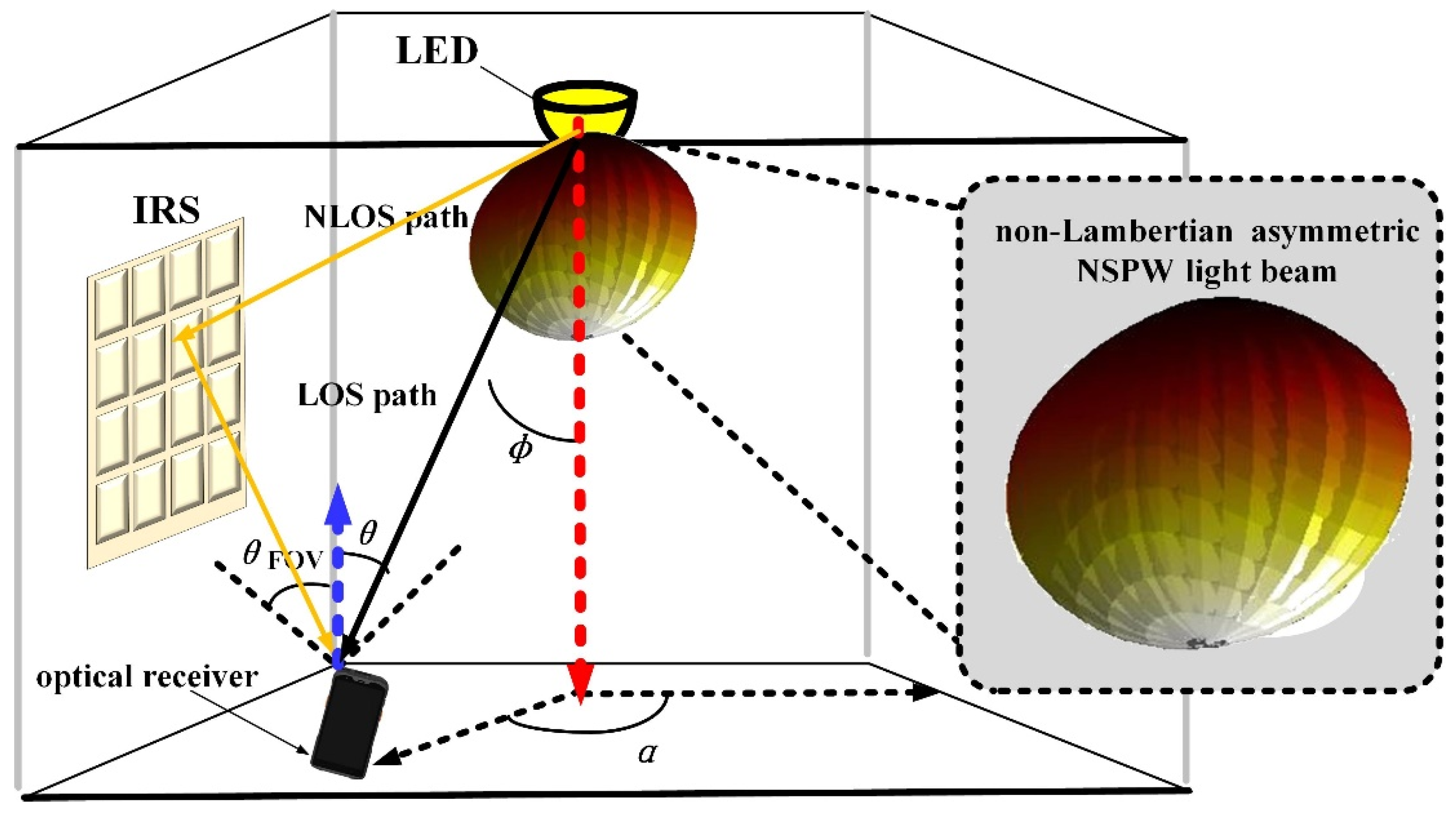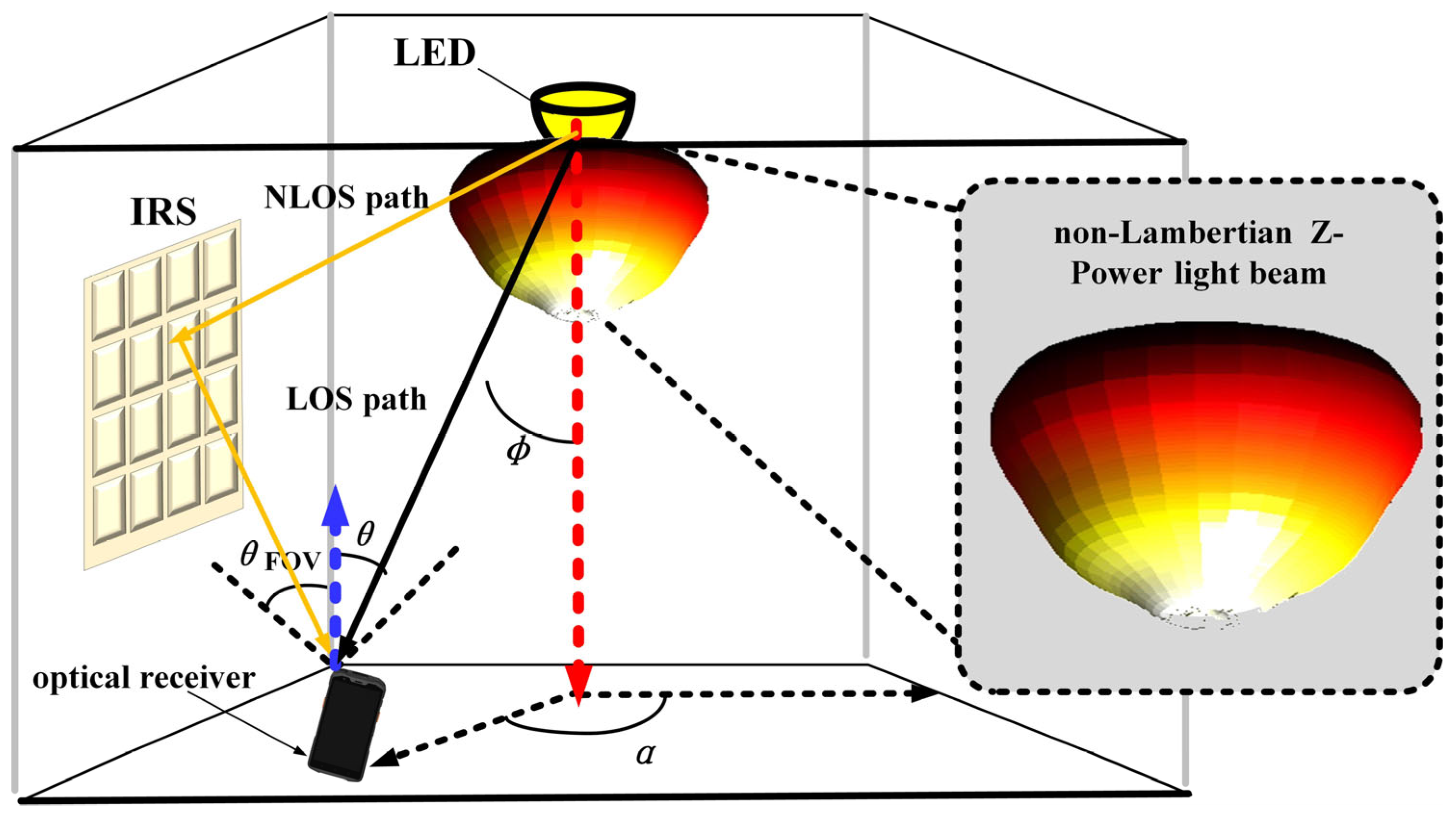 Figure 3, a typical indoor scenario is inherited to investigate the LED beam’s effects on the performance of IRS-assisted VLC, except for the involved LED radiation beam. And for fair comparison, all concerned non-Lambertian radiation patterns are normalized by a power normalization factor in the following work of IRS-assisted VLC. Furthermore,