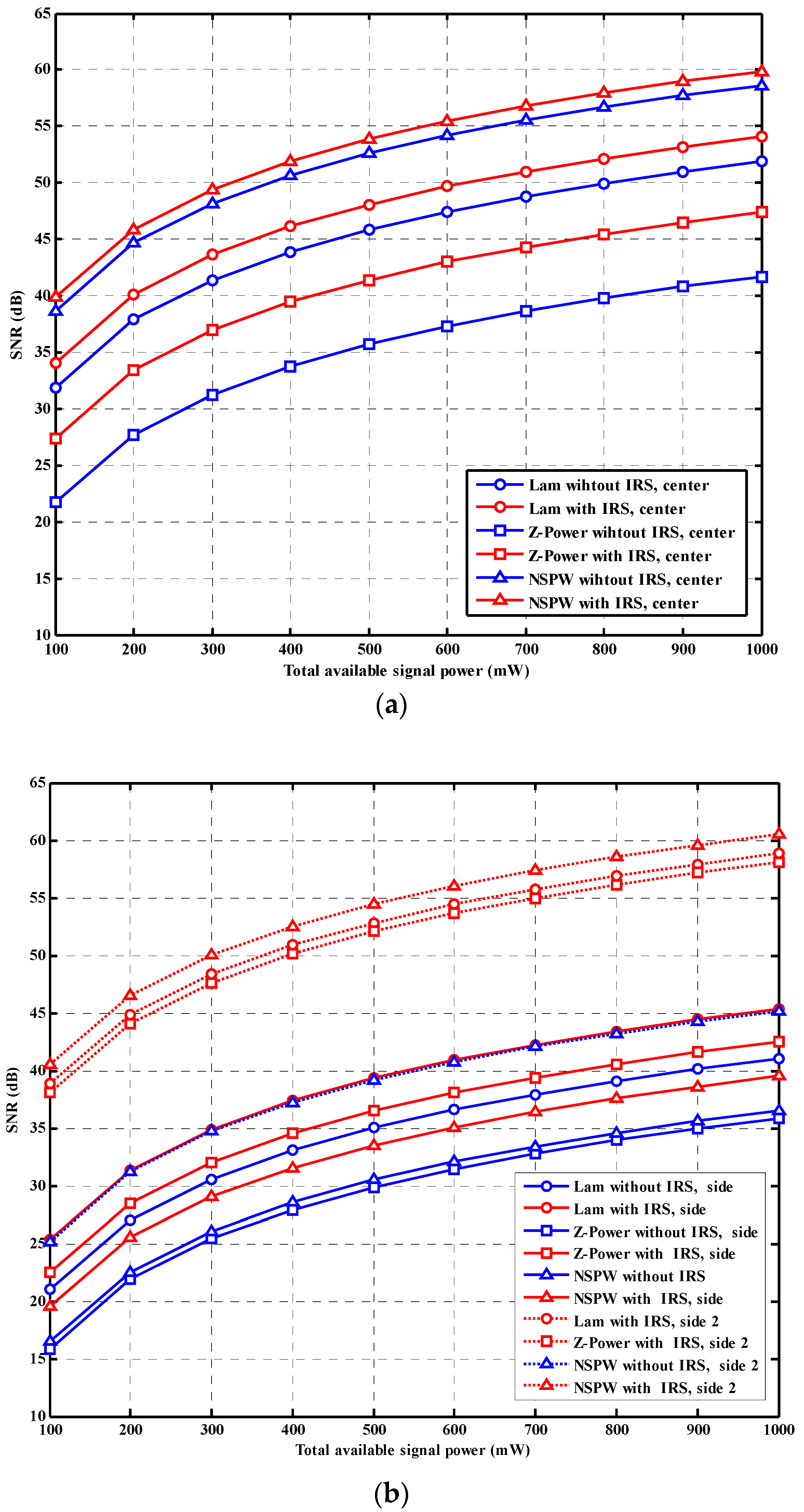 Figure 4a, when IRS assistance is absent, the initial received SNR of conventional Lambertian beam pattern-based VLC is 31.87 dB. On the other hand, if IRS assistance is available for the baseline Lambertian VLC scenario, the initial received SNR is enhanced to 34.10 dB, which means that a 2.23 dB SNR enhancement is provided by the application of an IRS. In the meantime, as for the non-Lambertian Z-Power light beam-based VLC, the initial received SNR is just 21.71 dB with the absence of IRS assistance, while the counterpart is increased to 27.42 dB with the adoption of IRS assistance. This indicates that up to a 5.71 dB SNR enhancement is provided to non-Lambertian Z-Power VLC. Then, for the non-Lambertian, asymmetric NSPW light beam-based VLC, the initial received SNR goes up to a maximum of 38.63 dB with the absence of IRS assistance. Once IRS assistance is applied, this performance metric is slightly improved to 39.87 dB, which means that only a 1.24 dB gain could be brought to the non-Lambertian NSPW VLC for the receiver central position with the best channel condition. On the other, hand, when the available emitted signal power is increased to 1000 mW from the initial 100 mW, if IRS assistance is not available, the received SNR is changed to 51.87 dB, 41.71 dB, and 58.63 dB for the baseline Lambertian, non-Lambertian Z-Power, and non-Lambertian NSPW VLC scenarios, respectively, while this performance metric is separately varied to 54.10 dB, 47.42 dB, and 59.87 dB if IRS assistance is available. Accordingly, the SNR gain provided by the IRS assistance is 2.23 dB, 5.71 dB, and 1.24 dB for the three VLC link configurations concerned when the final 1000 mW signal power is emitted from the LED transmitter.