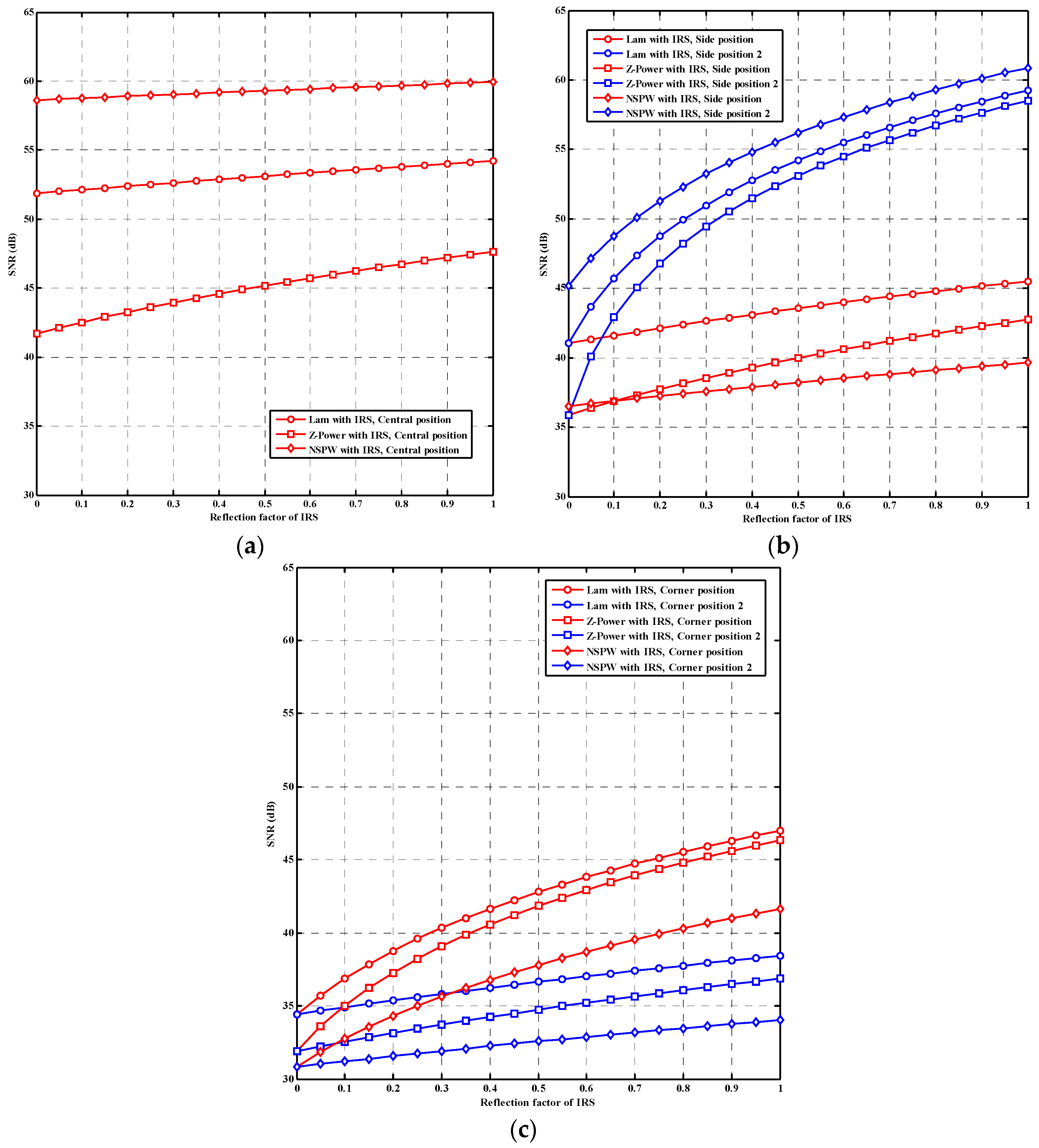Figure 5c, when the reflection factor of the IRS is the minimum, at both corner positions, the initial received SNR for baseline Lambertian, non-Lambertian Z-Power, and non-Lambertian NSPW VLC is just 34.41 dB, 31.91 dB, and 30.83 dB, separately. Once the reflection factor of the IRS is increased to the ideal maximum, i.e., 1, at corner position 1, the received SNR for baseline Lambertian, non-Lambertian Z-Power, and non-Lambertian NSPW VLC is significantly enhanced to 46.99 dB, 46.35 dB, and 41.63 dB, accordingly, which means that the maximum gain achieved by the IRS is up to 12.58 dB, 14.44 dB, and 10.80 dB for the three VLC configurations at corner position 1 of the light receiver. However, at corner position 2, the received SNR for baseline Lambertian, non-Lambertian Z-Power, and non-Lambertian NSPW VLC is slightly varied to 38.42 dB, 36.87 dB, and 34.02 dB, accordingly, which means that the maximum gain achieved by the IRS is just 4.01 dB, 4.96 dB, and 3.19 dB for the three VLC configurations at corner position 2 of the light receiver. This phenomenon is mainly due to corner position 1 being relatively closer to the IRS than corner position 2, while the domination of the LoS channel gain from the LED transmitter is further reduced to both corner positions due to the maximum LoS propagation distance between the LED transmitter and the two corner positions, simultaneously.