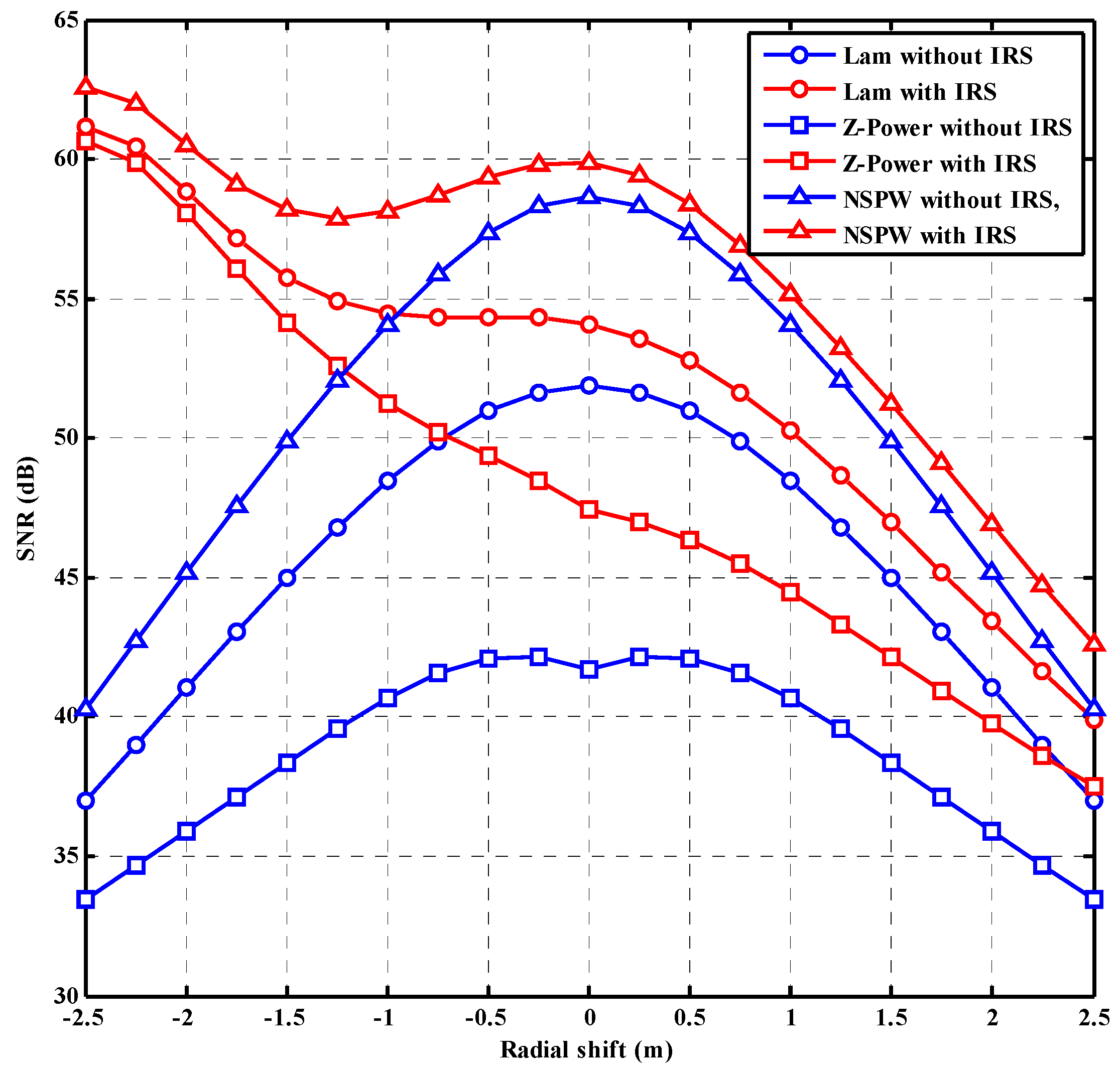 On the other hand, with IRS assistance, the received SNR of the initial central position of the light receiver is 54.10 dB, 47.42 dB, and 59.87 dB for baseline Lambertian, non-Lambertian Z-Power, and non-Lambertian NSPW VLC, which means that the initial gain given by the IRS assisting is 2.23 dB, 5.71 dB, and 1.24 dB, separately. With the increase in the radial shift of the VLC receiver along the negative direction of the x-coordinate axis, the received SNRs for baseline Lambertian and non-Lambertian Z-Power VLC are gradually varied to the respective maximums 61.17 dB and 60.66 dB, while the received SNR for the non-Lambertian NSPW VLC is varied to the local minimum 57.89 dB, with an about −1.25 m radial shift, and then increased to the maximum 62.58 dB with a final −2.5 m radial shift. This observation illustrates that a final gain of 24.16 dB, 27.20 dB, and 22.31 dB could be provided by the IRS assisting with the final radial shift along the negative direction of the x-coordinate axis; thanks to that, the spatial distance between the VLC receiver and the IRS is dramatically reduced with more radial shift along this direction.