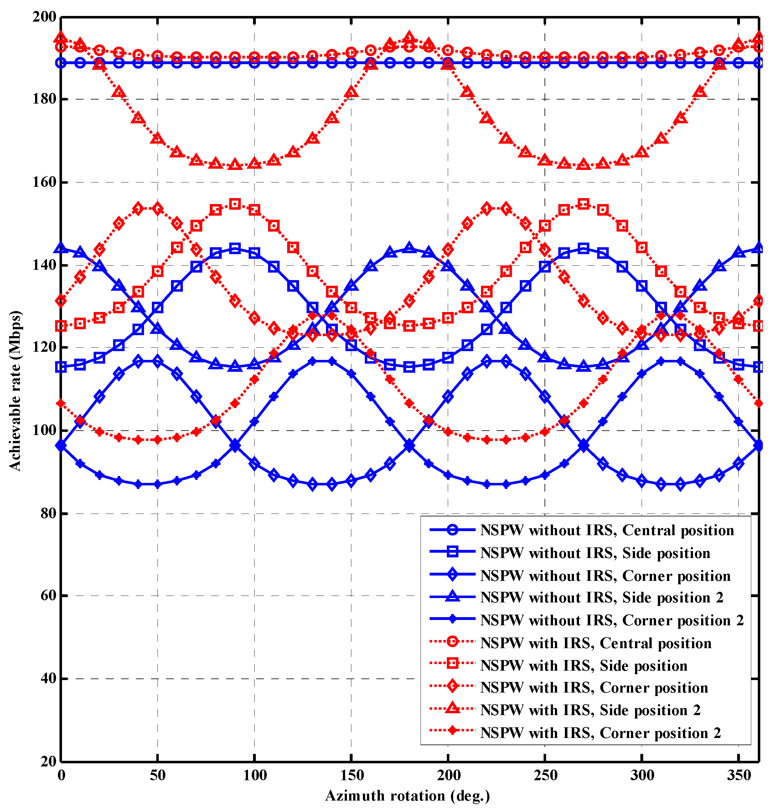 Figure 7, for the central position of the receiver, without IRS assistance, the achievable data rate is constant at 188.72 Mbps, since this position is just under the LED transmitter and any beam azimuth deviation could not vary the central radiation intensity, i.e., the radiation intensity in this direction of the central position. It must be noted that once IRS assistance is adopted, the achievable data rate performance of the central position will be mildly influenced periodically as well, which is mainly because the IRS-reflected channel gain is periodically changed by the azimuth deviation of the NSPW light beam, to some extent. Particularly, as the azimuth deviation angle is 0 deg., 180 deg., and 360 deg., the maximum achievable data rate, i.e., 192.84 Mbps, is derived for this central position, which means that the available maximum gain among all possible azimuth deviation angles is just 4.12 Mbps via IRS assistance.