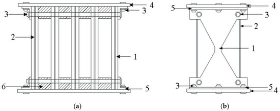 Shock absorber structure diagram. 1: X steel plate; 2: SMA wire; 3: high-strength bolts; 4: horizontal steel plate; 5: angle steel; 6: gaskets. (a) Shock absorber side diagram; (b) shock absorber facade schematic diagram.