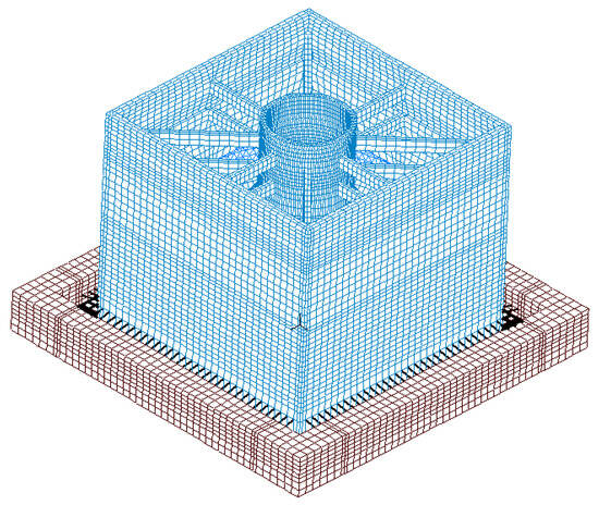 Within the FEA model (Figure 3), 3D solid elements are employed to simulate the solid structural components, while viscoelastic boundaries are modeled using spring elements. The liquid is simulated via 3D fluid elements based on the subsonic potential flow theory, with a fluid density of 1000 kg/m3. The interface between the fluid and the structure is defined as a fluid–structure interaction (FSI) interface, and a free potential boundary condition is imposed on the liquid’s free surface. Rayleigh damping is applied to the concrete liquid storage structure. The modeling parameters for the concrete (of the liquid storage structure) and the internal liquid are presented in Table 1.