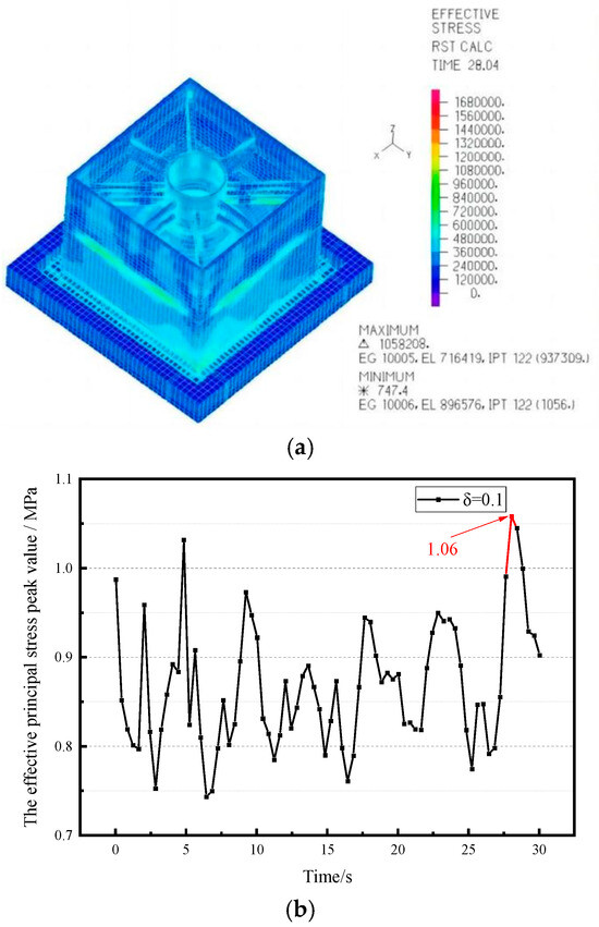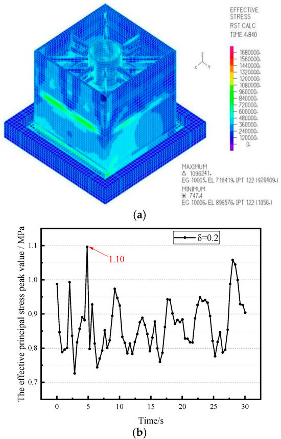 Figure 13 shows that the maximum principal stress of the CLSS occurs at the upper connecting beam, with a peak value of 1.06 MPa. As indicated by the curve of peak maximum principal stress, the CLSS’s maximum principal stress varies over time and reaches a peak of 1.06 MPa at 28.04 s.