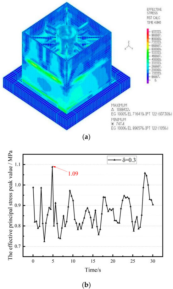 Figure 7 shows that the maximum principal stress of the structure occurs at the external wall panel, with a value of 1.09 MPa. As indicated by the peak maximum principal stress curve, the structure’s maximum principal stress varies over time and reaches its peak of 1.09 MPa at 4.8 s.