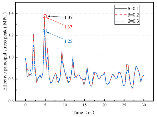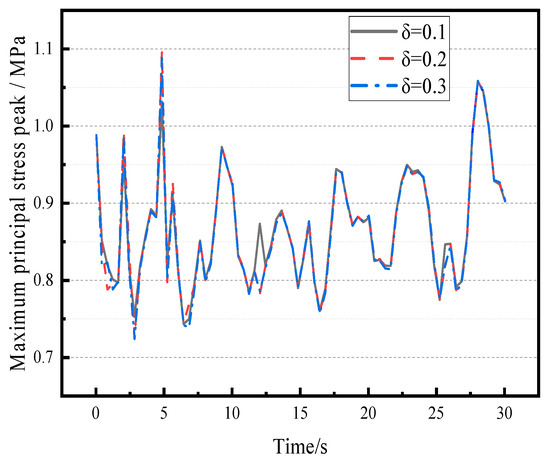 The maximum principal stress peak of LSS with different element spring-damping ratios (note: symbols in the figure correspond to different spring-damping ratios δ).