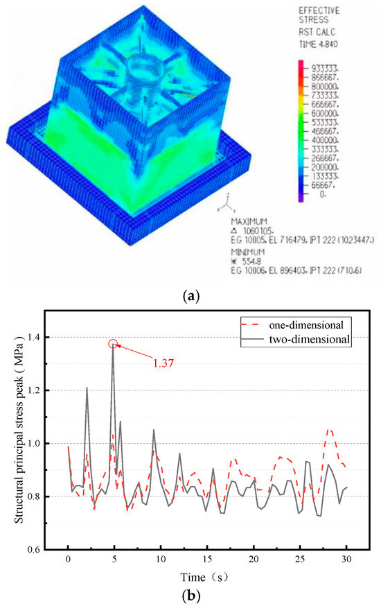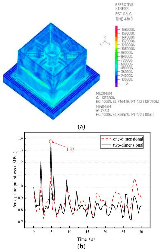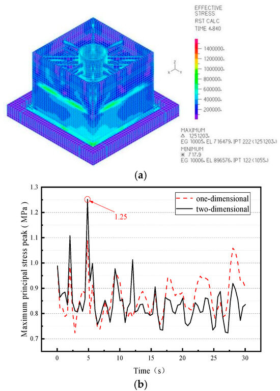 The maximum principal stress nephogram and peak value curve (note: the dashed line represents the response under one-dimensional seismic action, and the solid line represents the response under two-dimensional seismic action). (a) Maximum principal stress nephogram; (b) peak value curve.