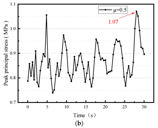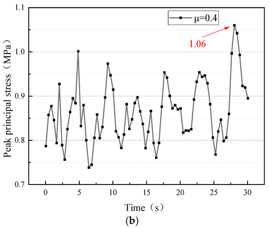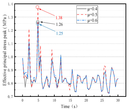 Figure 17 shows that when the sand isolation layer has a friction coefficient of 0.5, the CLSS exhibits a higher peak maximum principal stress than when the friction coefficient is 0.4 or 0.6. This indicates that under bidirectional seismic excitation, the CLSS achieves smaller maximum principal stress, and, thus, better seismic mitigation and control performance, when the sand isolation layer’s friction coefficient is set to 0.4 or 0.6.