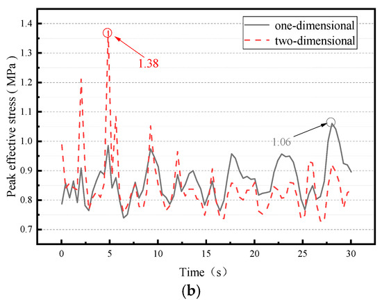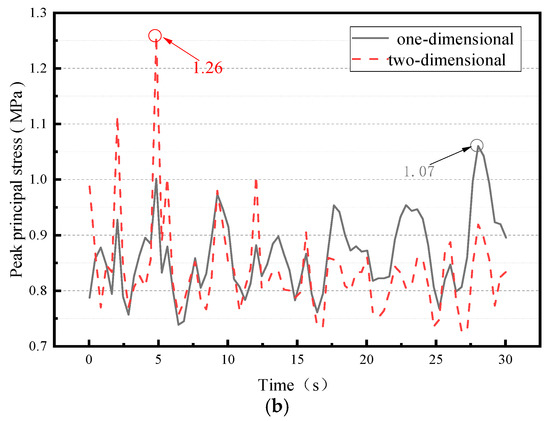 The curve of peak maximum principal stress for the CLSS under bidirectional seismic excitation is significantly more pronounced than that under unidirectional seismic excitation. Notably, the peak maximum principal stress exhibits greater variability under bidirectional seismic excitation. Under unidirectional seismic excitation, the fluctuation amplitude of the peak maximum principal stress curve remains relatively consistent within the first 32 s. In contrast, under bidirectional seismic excitation, the curve of peak maximum principal stress rises more rapidly within the first 5 s, after which the curve’s fluctuations tend to stabilize. This observation demonstrates that an increase in the seismic excitation dimension (from unidirectional to bidirectional) exerts a more significant impact on the CLSS’s maximum principal stress.