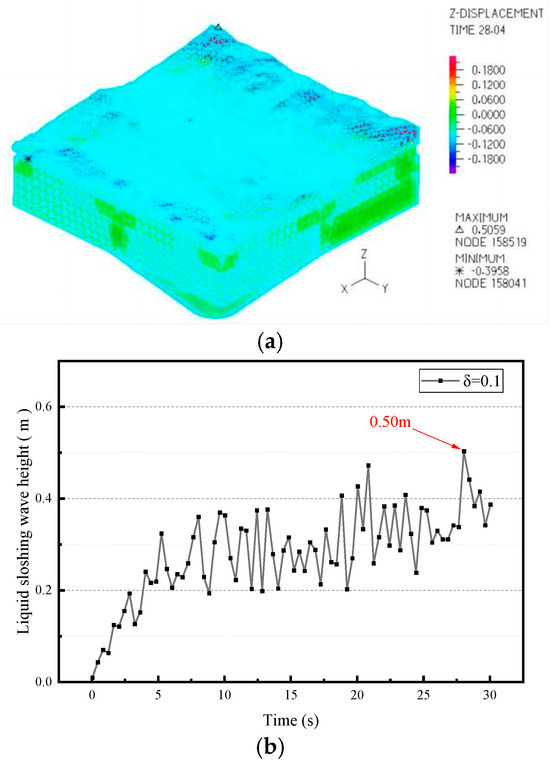 Liquid sloshing cloud diagram and sloshing wave peak value curve. (a) Liquid sloshing nephogram; (b) peak value curve.