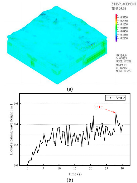 Figure 18 shows that the maximum sloshing wave height of the external liquid reaches 0.50 m at 28.04 s. According to Qi [20], under unidirectional El Centro seismic excitation, the maximum sloshing wave height of the non-isolated plate–shell composite CLSS is 0.97 m. This indicates that under unidirectional El Centro seismic excitation, the maximum sloshing wave height of the seismically isolated plate–shell composite CLSS is 48.4% lower than that of the non-isolated counterpart. Specifically, when the spring-damping ratio of the X-type (soft steel and SMA) dissipative shock absorber units is 0.1, the sloshing wave height of the CLSS is reduced by 48.4% compared to the non-isolated structure, demonstrating an obvious seismic mitigation effect.