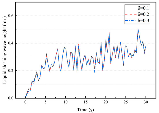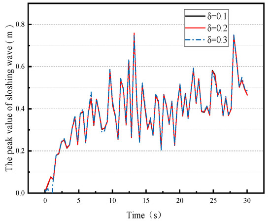 Peak value of liquid sloshing wave of LSS with different element spring-damping ratios (note: symbols in the figure correspond to different spring-damping ratios δ).