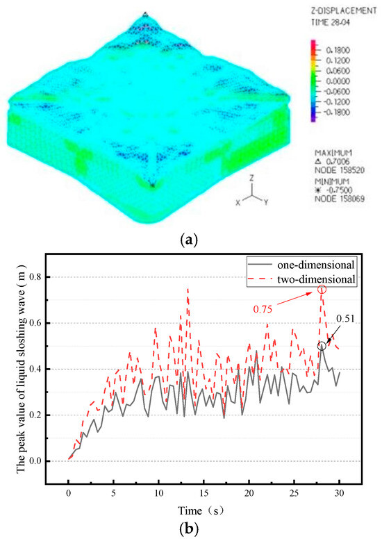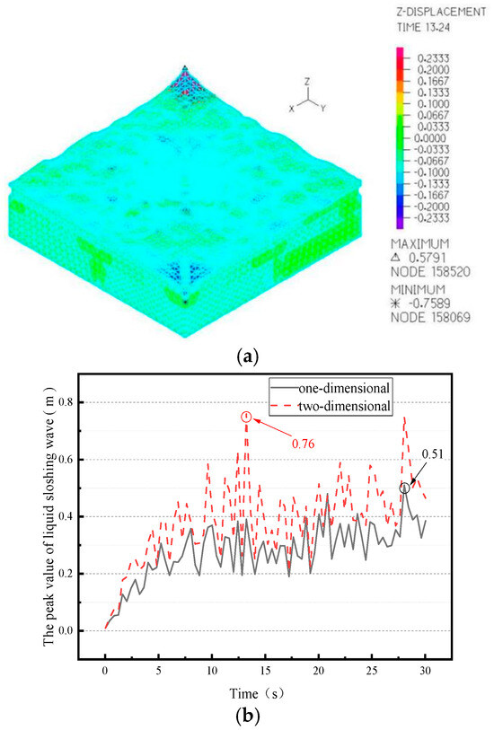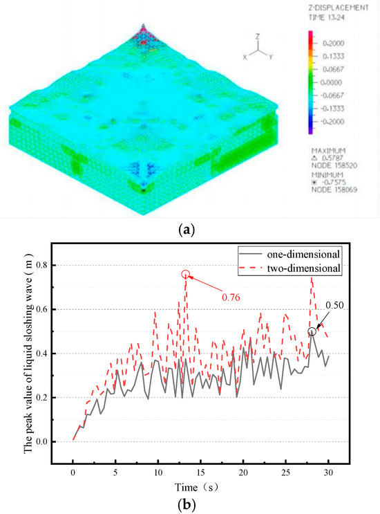 Liquid sloshing nephogram and sloshing peak value curve (note: the dashed line represents the response under one-dimensional seismic action, and the solid line represents the response under two-dimensional seismic action). (a) Liquid sloshing nephogram; (b) peak value curve.