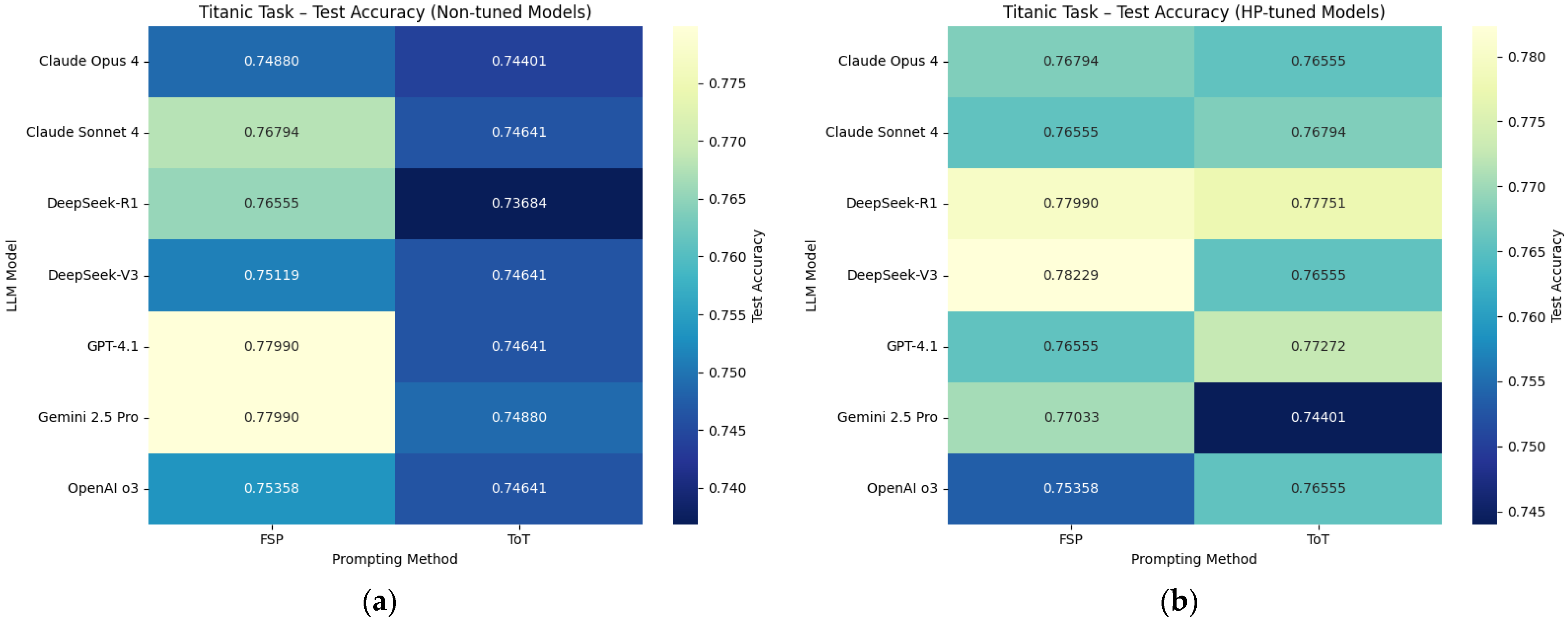 Titanic | DeepSeek-V3 (FSP (HP-tuned)) | Accuracy | 0.78229 | 0.80143 |