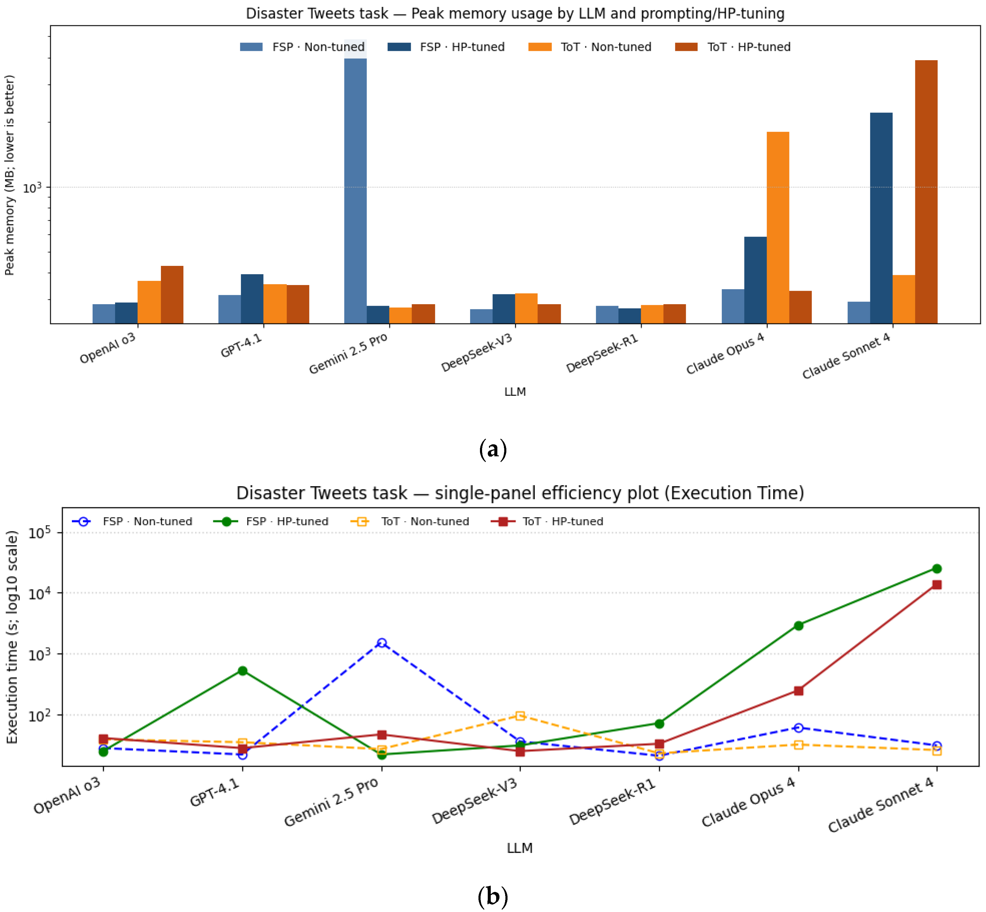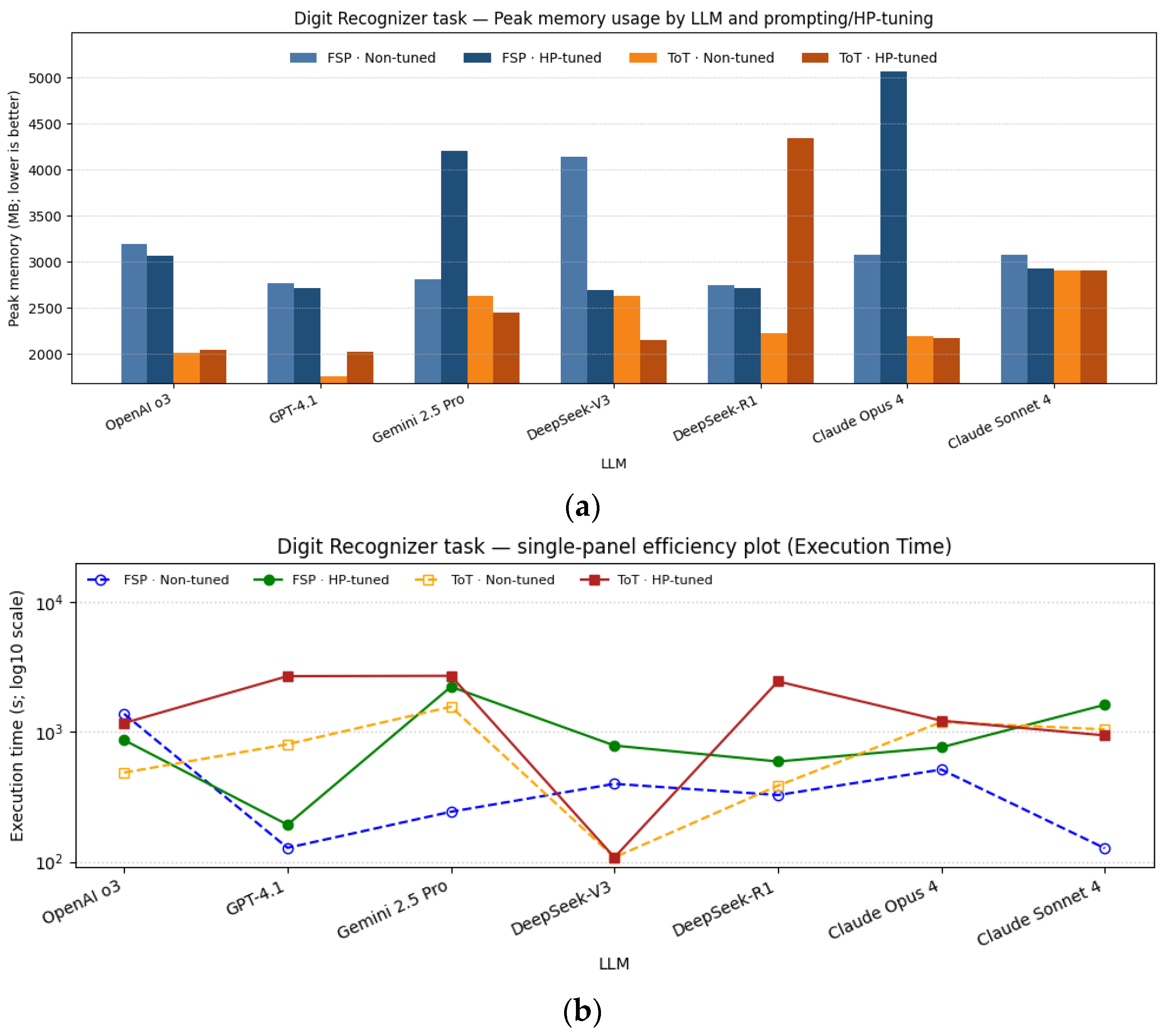 - There is no uniform trend in memory consumption; differences depend on the LLM model × prompting × tuning interaction and are small in most tasks.