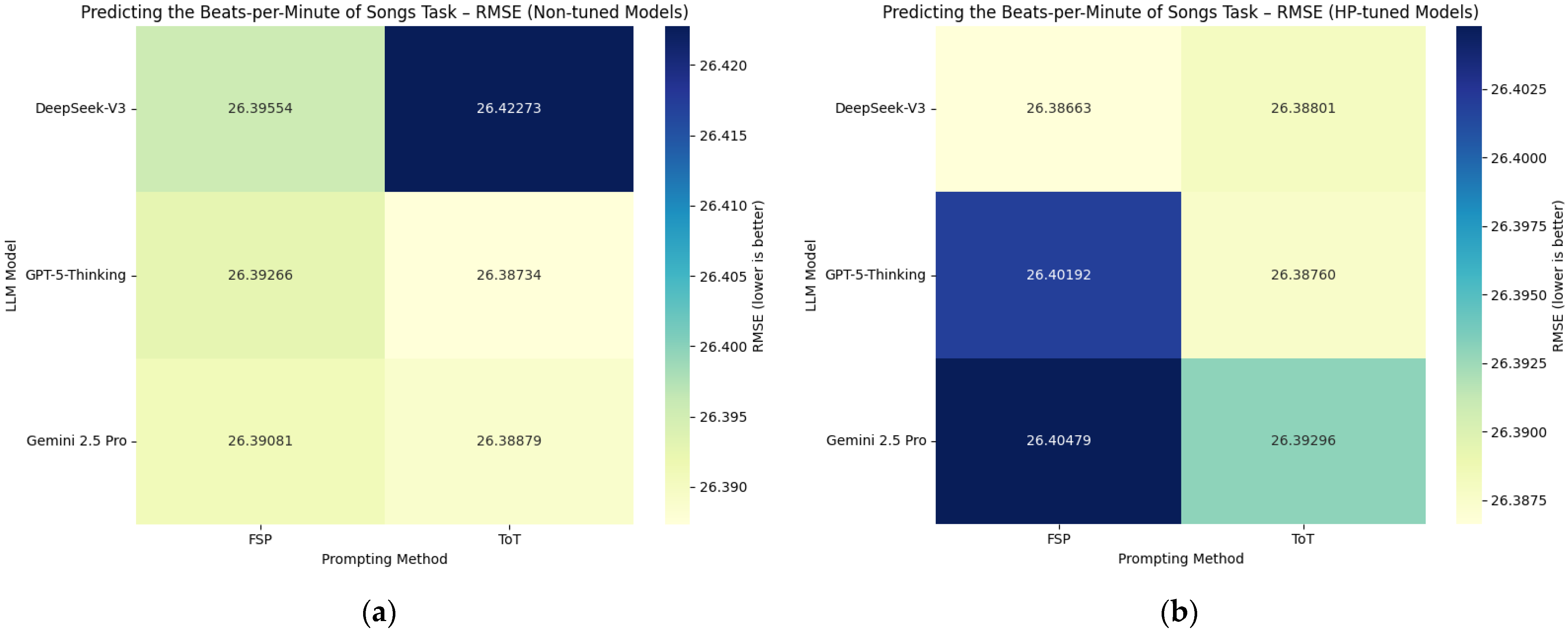 Beats-per-Minute of Songs | DeepSeek-V3 (FSP (HP-tuned)) | RMSE | 26.38663 | 26.38020 (20.09.2025) |