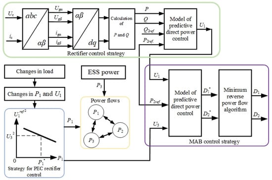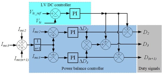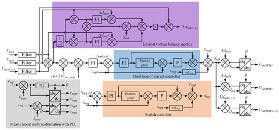 - the input module controller, which is responsible for the control of cascaded PECs with a dual-loop current control and the internal power balance module regulator during rectification (Figure 9);